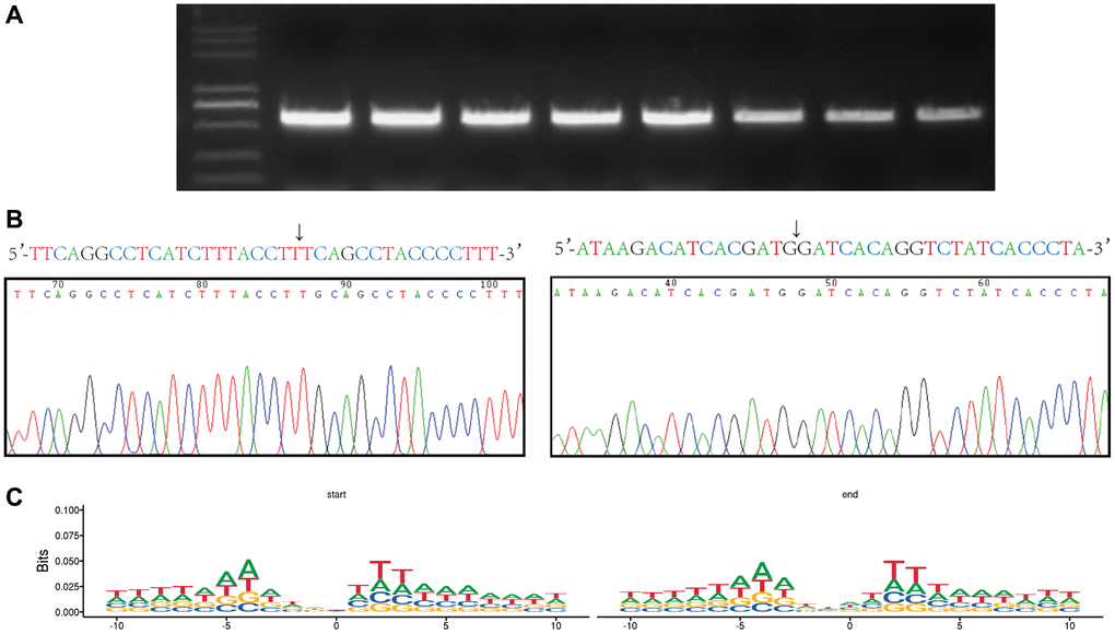 PCR was performed to process the DNA extracted from hBMSCs, and we found that partially screened eccDNA can be used to reveal the base sequence of the circularization site by performing Sanger sequencing (Figure 4A, 4B). Studies have analysed the base sequences upstream and downstream of the eccDNA junction and concluded that there is a pair of trinucleotide segments on both sides of the start and end position of the eccDNA, with 4-bp “spacers” in the middle [16, 17]. In this study, we used the motif to analyse the nucleotide composition and then each eccDNA starts and end site at 10 bp upstream to 10 bp downstream and then obtained the same trinucleotide segments as previous studies. Interestingly, we obtained longer consecutive sequences of the same nucleotide composition (Figure 4C).