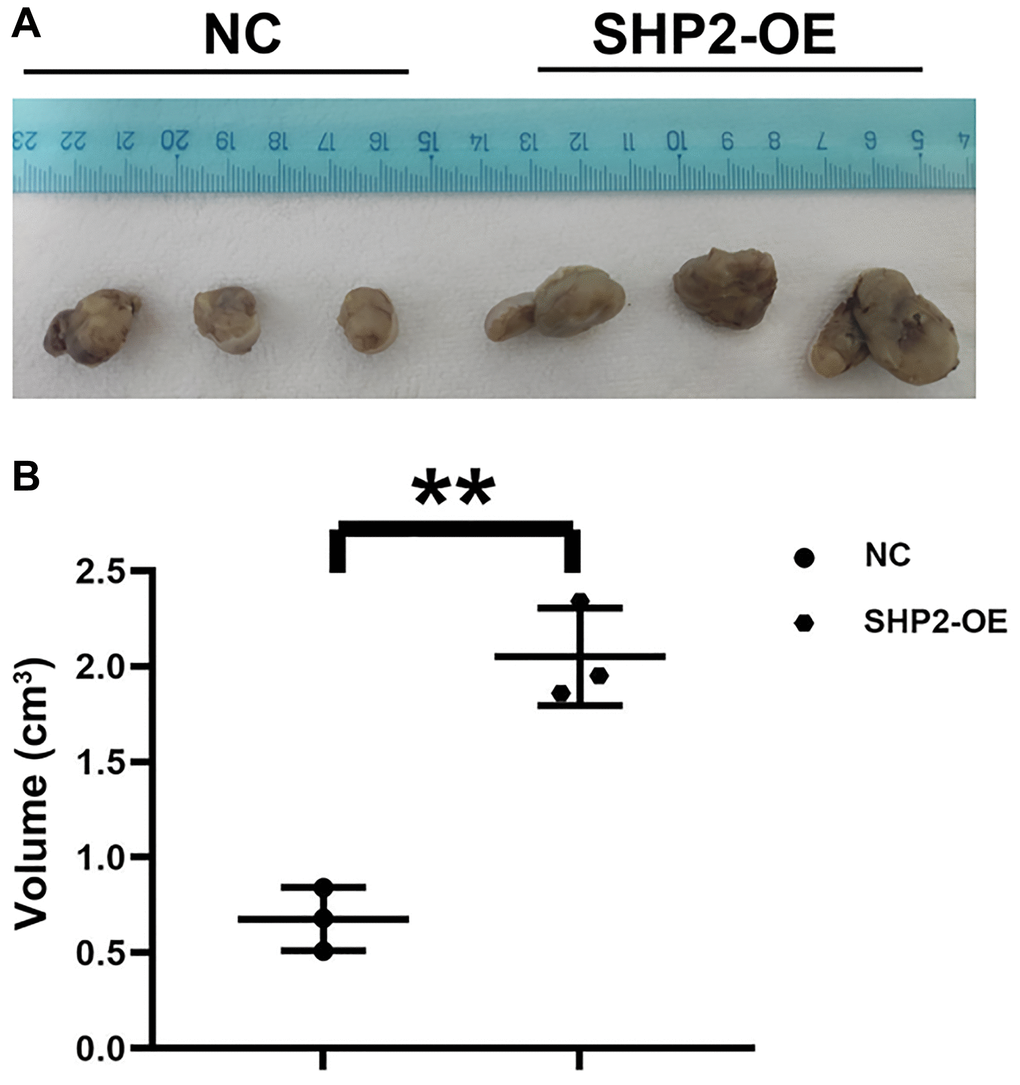 The impact of SHP2 in TAMs on the development of GC was detected by nude mouse tumor-bearing experiments. The results showed that the tumor volume in the SHP2-OE group significantly increased compared with the NC group, suggesting that SHP2 in TAMs can promote the progression of GC (Figure 1).