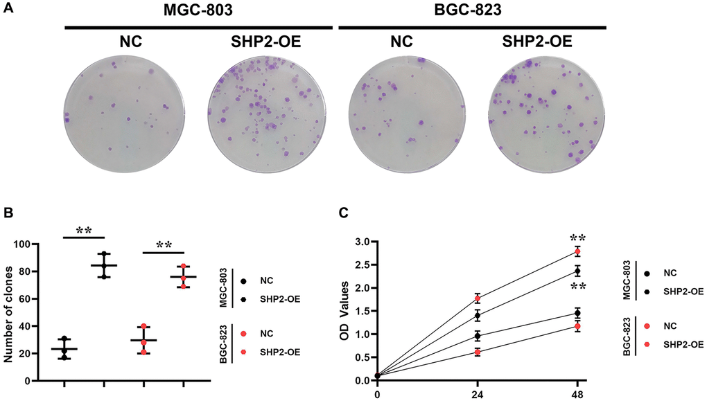 Colony formation assay is one of the useful methods for assessing the cell proliferation capacity. Not every cell can proliferate to form colonies after adherence to the wall, but the cells that form colonies must have the ability to adhere to the wall and proliferate. The colony formation rate indicates the number of adherent cells surviving and forming colonies after inoculation, which can be used to reflect the cell proliferation capacity. The results of colony formation assay showed that overexpression of SHP2 could increase the number of colonies in MGC-803 and BGC-823 cells. Besides, the CCK8 reagent contains a water-soluble yellow substance called formazan that can be reduced by dehydrogenase in the cellular mitochondria, which is proportional to the number of viable cells under certain conditions, so the cell viability can be determined by detecting the OD value of formazan at 450 nm. The results of CCK8 assay showed that overexpression of SHP2 could increase the OD values of MGC-803 cells and BGC-823 cells. To sum up, SHP2 in TAMs can enhance the proliferation of GC cells (Figure 2).