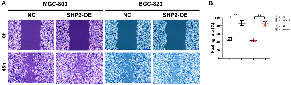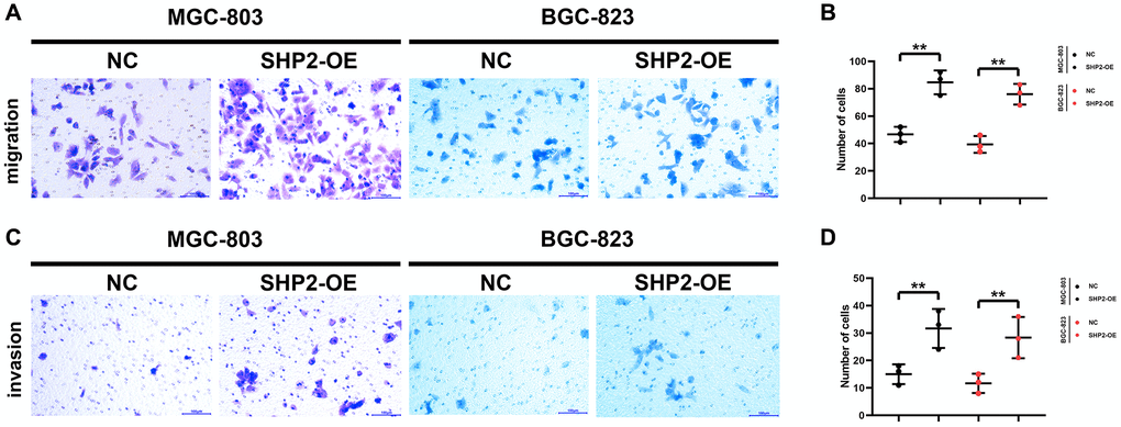 A blank area called “scratch/wound” is artificially created on the monolayer cells, and the cells at the edge of the scratch/wound will gradually enter the blank area, so that the “scratch/wound” is healed. Images are captured at the beginning and during the cell migration process. The cell migration capacity is judged by measuring the scratch/wound distance at different time points. This process bears a similarity to the wound healing process in vitro, so it is also called wound healing assay, which can be utilized to observe the effects of exogenous factors such as drugs and genes on cell migration, repair and interaction. In this study, the results of wound healing assay revealed that overexpression of SHP2 could increase the wound healing rate of MGC-803 cells and BGC-823 cells (Figure 3). Besides, Transwell assay is to separate the high-nutrient culture medium from the low-nutrient culture medium using a layer of polycarbonate membrane. The cells are inoculated in the low-nutrient culture medium. Usually, the membrane pores are covered with Matrigel, which can mimic the ECM, and tumor cells must secrete hydrolase to pass through the filter membrane. The number of cells entering the lower chamber can reflect the migration and invasion capacity of tumor cells. In this study, the results showed that overexpression of SHP2 could increase the number of migrating and invading MGC-803 cells and BGC-823 cells (Figure 4). To sum up, SHP2 in TAMs can enhance the migration and invasion of GC cells.