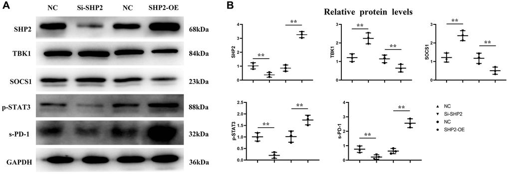SHP099 enhances type I interferon signaling in macrophages by regulating the STING/TBK1/IRF3 pathway. Notably, the SHP2-mediated ubiquitin ligase TRIM27-induced degradation of TBK1 was investigated previously. Furthermore, it has been reported that SHP2 can directly bind to the kinase domain of TBK1 through the C-terminal domain (273e538, including the PTP domain), thereby inhibiting the phosphorylation of substrates. SOCS1 can promote the JAK2/STAT3 signaling pathway and enhance the expression levels of VEGFA, FGF2 and MMP9 in fibroblasts, and the activation of STAT3 can increase the expression of PD-1 [20, 21]. In this study, the results of Western blotting showed that in the si-SHP2 group, the relative protein expression levels of SHP2, p-STAT3 and s-PD-1 in TAMs were significantly lower, while the relative protein expression levels of TBK1 and SOCS1 were significantly higher than the NC group. In the SHP2-OE group, the relative protein expression levels of SHP2, p-STAT3 and s-PD-1 were significantly higher, while the relative protein expression levels of TBK1 and SOCS1 were significantly lower than the NC group. In exosomes, the relative protein expression levels of CD9, TSG101 and s-PD-1 were significantly lower in the si-SHP2 group than the NC group, while they were significantly higher in the SHP2-OE group than the NC group.