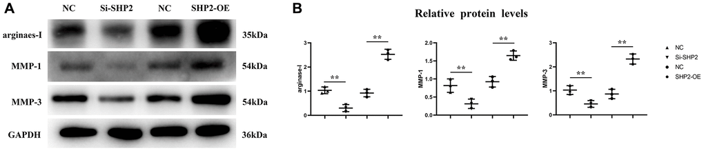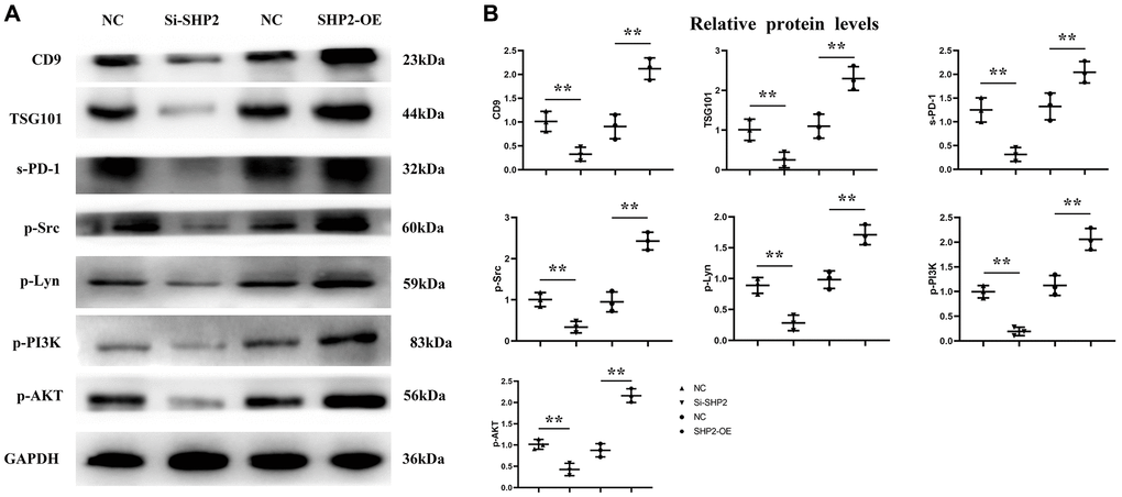 THP-1 cells and isolated exosomes were lysed, and centrifuged to extract the proteins at 4°C. Then the proteins were loaded, subjected to SDS-PAGE, and transferred onto PVDF membranes. The membrane was blocked with 5% nonfat milk powder, and incubated with primary antibodies against SHP2 (Abcam, ab300579, 1:1000), TBK1 (Abcam, ab40676, 1:5000), SOCS1 (Abcam, ab280886, 1:1000), p-STAT3 (Abcam, ab76315, 1:2000), s-PD-1 (Abcam, ab214421, 1:1000), CD9 (Abcam, ab307089, 1:1000), TSG101 (Abcam, ab125011, 1:1000), p-Src (Abcam, ab185617, 1:5000), p-Lyn (Abcam, ab278639, 1:1000), p-PI3K (Abcam, ab182651, 1:500), p-AKT (Abcam, ab38449, 1:1000), Arginase-1 (Abcam, ab203490, 1:1000), MMP1 (Abcam, ab137332, 1:1000), MMP3 (Abcam, ab52915, 1:1000) and GAPDH (Abcam, ab8245, 1:10000). After washing three times with TBST, the membrane was incubated with secondary antibodies for 2 hours, and washed three times again with TBST. Finally, the protein expressions were analyzed.