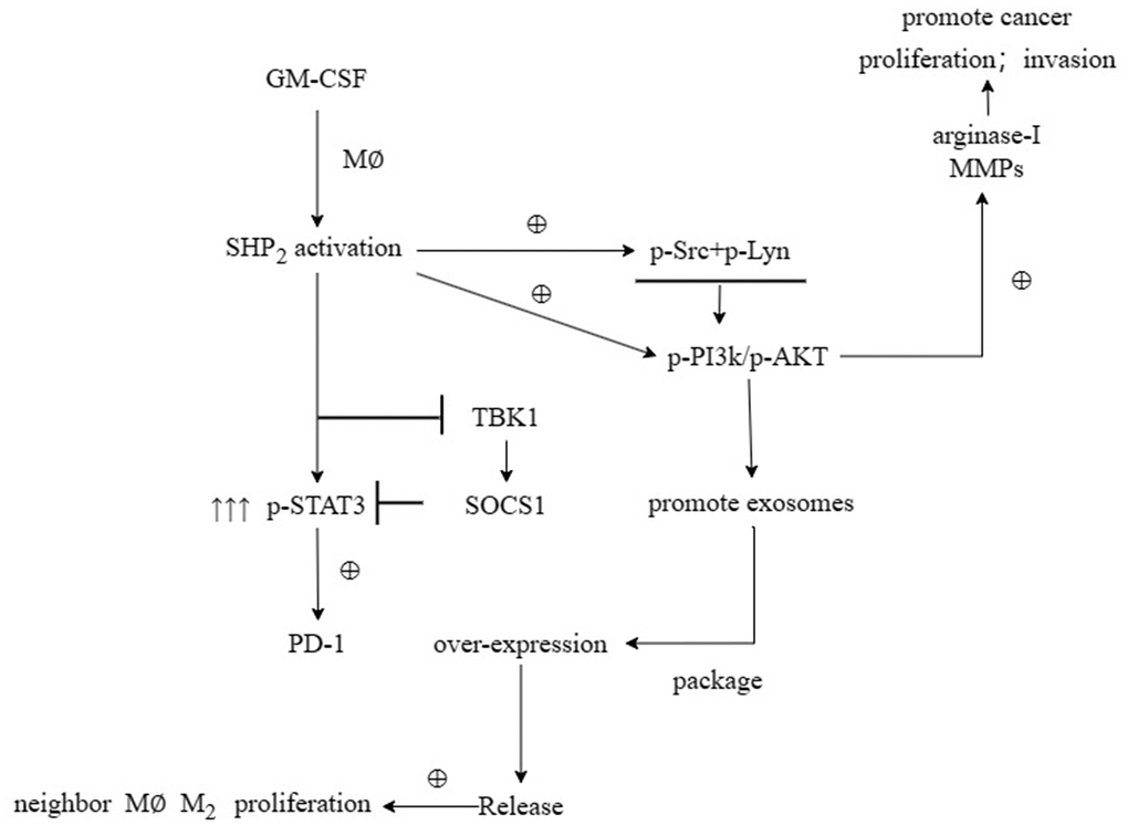 In conclusion, M-CSF secreted by GC cells can increase the expression of SHP2 in TAMs, thereby promoting the secretion of exosomes and M2 polarization of TAMs as well as the proliferation, invasion, and migration capacity of GC cells.