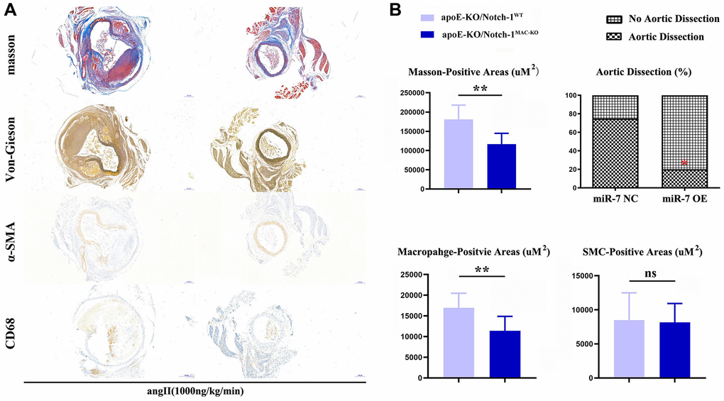 The results of Masson staining, EVG staining and immunohistochemical staining showed that the macrophage-positive area and the area of aneurysms in the ApoE-KO/Notch-1MAC-KO group significantly decreased compared with the ApoE-KO/Notch-1WT group (P < 0.01), while the SMC-positive area was not significantly different between the two groups (P > 0.05, P = 0.8394), indicating that macrophages play a major role in the regulation of AAA (Figure 2).