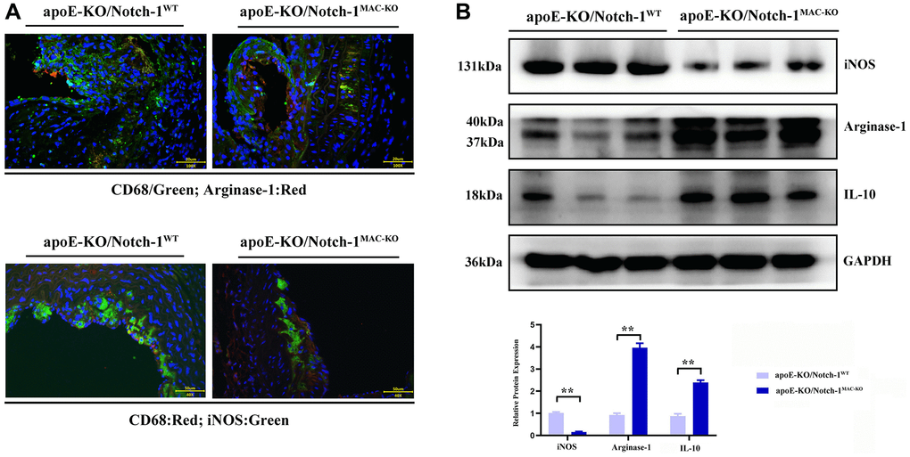 The results of Western blotting revealed that knockout of Notch-1 decreased the expression of iNOS (an M1 macrophage marker) (P < 0.01), but increased the expressions of IL-10 and Arginase-1 (M2 macrophage markers) (P < 0.01). It can be seen that Notch-1 may promote M1 macrophage polarization, while knockout of Notch-1 promotes M2 macrophage polarization. Besides, the immunofluorescence results showed that the number of iNOS-expressing macrophages in Notch-1-knockout mice decreased after M1 polarization, i.e., M1 polarization was impaired after the knockout of Notch-1. In contrast, the number of Arginase-1-expressing macrophages in Notch-1-knockout mice increased after M2 polarization (Figure 3).
