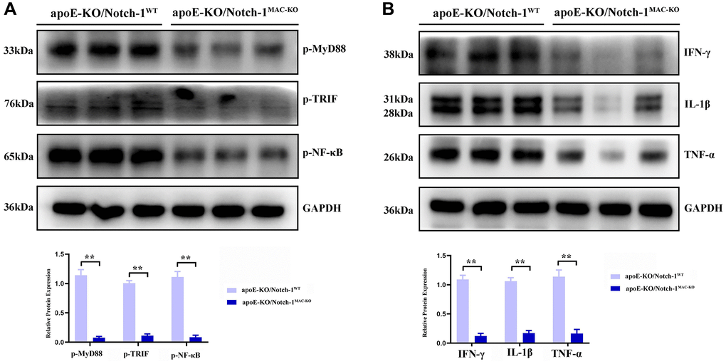 MyD88/TRIF pathway, which activates NF-κB accompanied by an excessive expression of inflammatory factors, is the major and key pathway accelerating aneurysm progression. Then more inflammatory cells, especially M1 macrophages, accumulate toward the aneurysm, thus accelerating aneurysm progression [13–16]. The results of Western blotting showed that after treatment with angiotensin II, the MyD88/TRIF/NF-κB signaling pathway was activated, thus inducing an inflammatory response in the artery. In Notch-1MAC-KO mice, the phosphorylation levels of the MyD88/TRIF/NF-κB signaling pathway-related proteins were significantly inhibited, accompanied by significant decreases in the protein expressions of inflammatory factors IFN-γ, IL-1β and TNF-α (P < 0.01) (Figure 5).