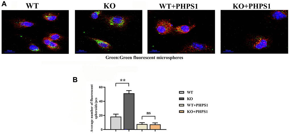 To verify the effect of myeloid-specific knockout of Notch-1 on the phagocytic capacity of macrophages, the phagocytosis assay with fluorescent microspheres was designed. The results showed that the number of fluorescent microspheres phagocytosed in the ApoE-KO/Notch-1MAC-KO group was significantly larger than that in the ApoE-KO/Notch-1WT group. However, after the addition of PHPS1, the number of fluorescent microspheres phagocytosed decreased significantly in both groups, without significant differences (Figure 6).