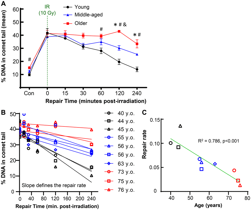 - 36. Singh NP, Danner DB, Tice RR, Brant L, Schneider EL. DNA damage and repair with age in individual human lymphocytes. Mutat Res. 1990; 237:123–30. https://doi.org/10.1016/0921-8734(90)90018-m [PubMed]