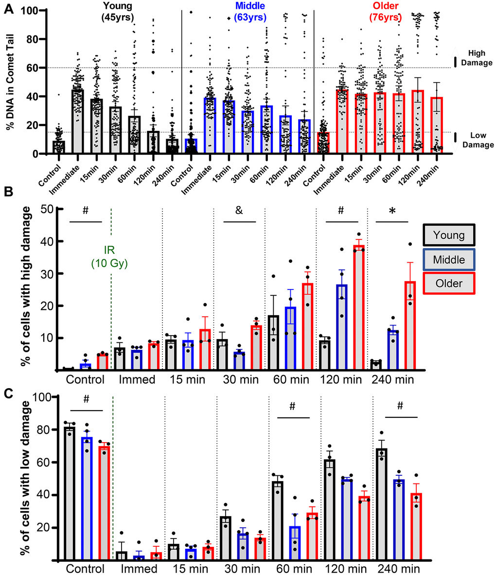 Insight can be gained by assessing the distribution of damage within individual cells for each donor, as shown for representative young, middle, and older donors (Figure 3A). Of note, there was a bifurcated response in the older donors, with a significant fraction of cells retaining very high levels of damage (above the dotted line that demarcates 60% of the DNA in comet tails). When quantified across all donors, 27.6% of chondrocytes in the older group retained this high level of damage at 4 hours, whereas this percentage was 12.5% and 2.6% for middle-aged and younger donors, respectively (Figure 3B). Analysis of chondrocytes with <15% DNA in comet tails at 4 hours showed that 68.7%, 49.6%, and 41.3% of cells from young, middle-aged, and older donors, respectively, repaired the damage from irradiation to near-baseline levels (Figure 3C).