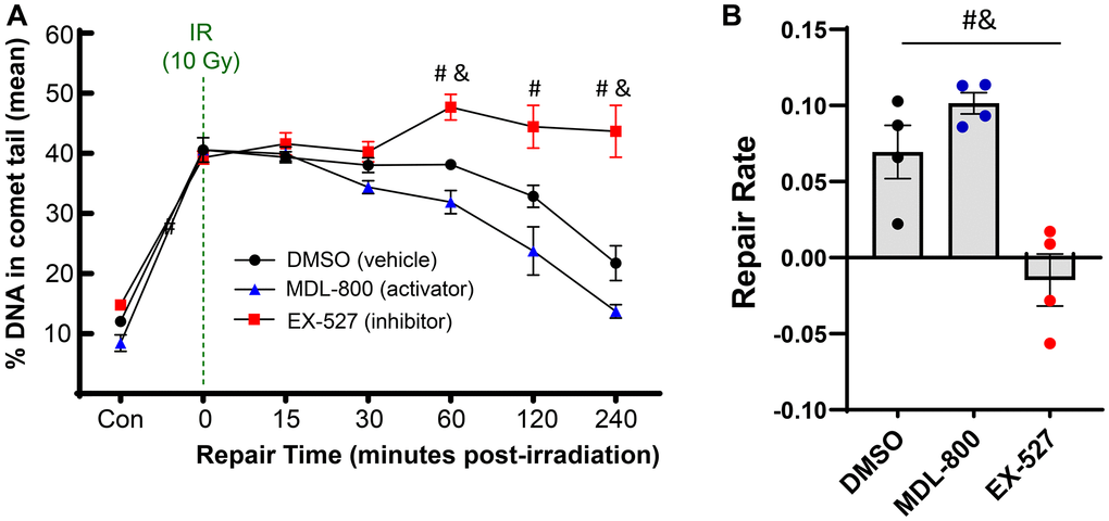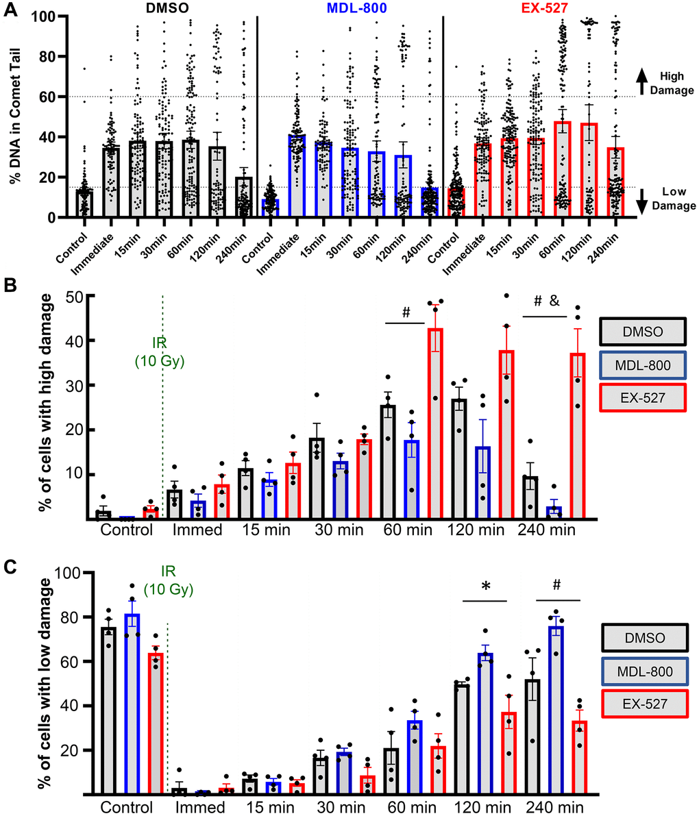 The all-cell plot shows a striking increase in the percentage of individual cells that retain high levels of DNA damage in the EX-527 group (Figure 5A). At 4 hours, 37.2% of cells in the EX-527 group still had greater than 60% of the DNA in comet tails, while only 2.9% of cells in the MDL-800 group had high levels of damage (Figure 5B). When comparing the percentage of cells with low levels of DNA damage, MDL-800 treatment significantly increased the likelihood that cells can restore near-baseline levels of damage at two and four hours post-irradiation (Figure 5C).