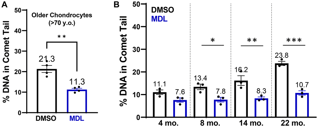 Prior work completed in our lab has demonstrated that primary human chondrocytes accumulate damage in a linear manner with age, predominantly driven by strand breaks to the DNA [13]. The third objective of this study was to determine the extent to which MDL-800 can reduce the high levels of DNA damage present in chondrocytes from older donors. Similarly, we investigated whether murine chondrocytes show increased DNA damage with age and whether MDL-800 treatment is sufficient to reverse damage in this important model species.
