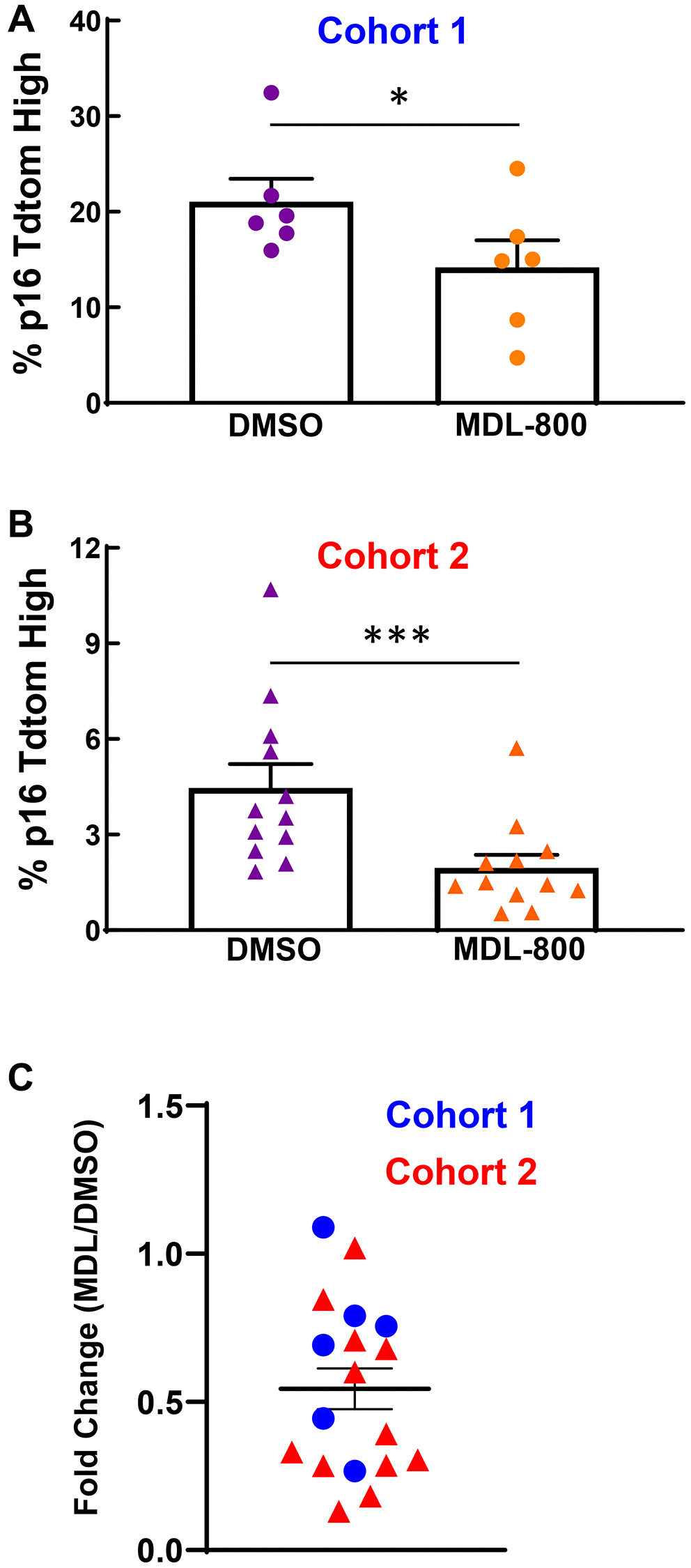 Persistent DNA damage is a common feature in numerous contexts that drive cellular senescence and other age-related dysfunction [30]. A causative role for DNA damage in senescence is supported by studies that apply exogenous DNA damage or disrupt DNA repair pathways; however, the inverse has been more challenging to test experimentally – does enhanced DNA repair efficiency mitigate senescence [31]? To provide an initial assessment of this possibility, a fourth goal was to treat murine hip cartilage explants with MDL-800 and assess senescence burden using a p16tdTom allele [32].