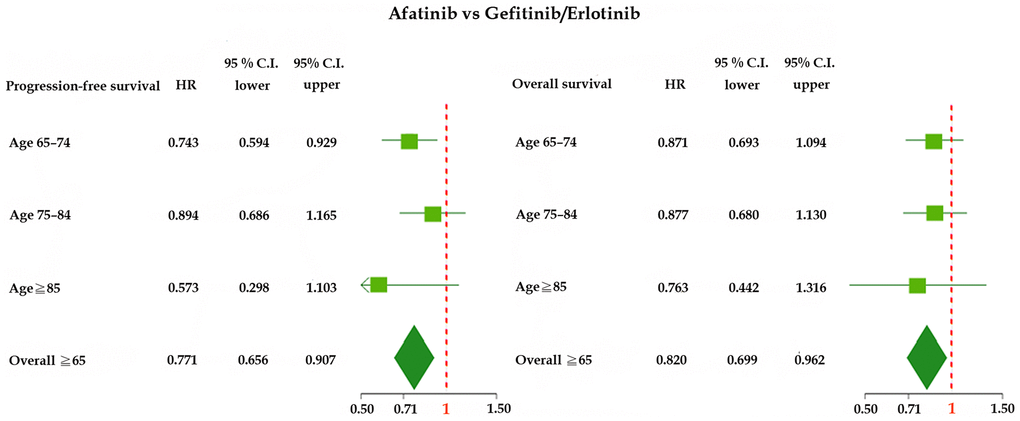 Lung cancer disproportionately affects older adults, with 71.1% of newly diagnosed patients being ≥65 years old and 36.2% being ≥75 years old [7]. This population often experiences physiological problems and increased comorbidities, with approximately half of those aged >75 years having two or more complications. Multiple factors, including polypharmacy, decreased social support, and limited economic resources, can affect the tolerability and effectiveness of cancer treatment for elderly patients [8]. The median age of patients was 63 years in the afatinib group and gefitinib group in the LUX-Lung 7 study [9], 61.5 years in the afatinib group in the LUX-Lung 3 study, 57 years in the gefitinib group in the IPASS study, and 65 years in the erlotinib group in the EURTAC study [4–6]. In the LUX-Lung 7 study [9], the only randomized study comparing afatinib and first-generation EGFR-TKIs, the benefit of afatinib for the subgroup (aged ≥65 years) receiving this therapy was nonsignificant, with a hazard ratio (HR) of 0.85 (95% confidence interval [CI] = 0.59–1.22) for PFS. Therefore, comparisons of the effectiveness and safety of these EGFR-TKIs approved for patients aged ≥65 years are limited.