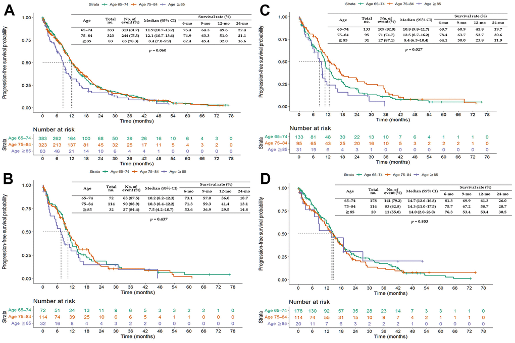 Elderly patients (aged ≥65 years) were further divided into three age groups and differences in their characteristics were examined. There were 383 patients aged 65–74 years, 323 aged 75–84 years, and 83 aged ≥85 years. The different age groups did not differ significantly in sex, smoking status, tumor morphology, and disease stage. PS worsened with age. Interestingly, the L858R point mutation was more common in patients aged ≥85 years (71.1%) than in those aged 75–84 (56.0%) or 65–74 (53.5%) years (p = 0.014). In addition, the choice of EGFR-TKI was age-dependent (p < 0.0001); gefitinib or erlotinib was prescribed more frequently as age increased, while afatinib was prescribed less frequently. The patients’ characteristics and the distribution of EGFR-TKIs among the age groups are summarized in Table 1.