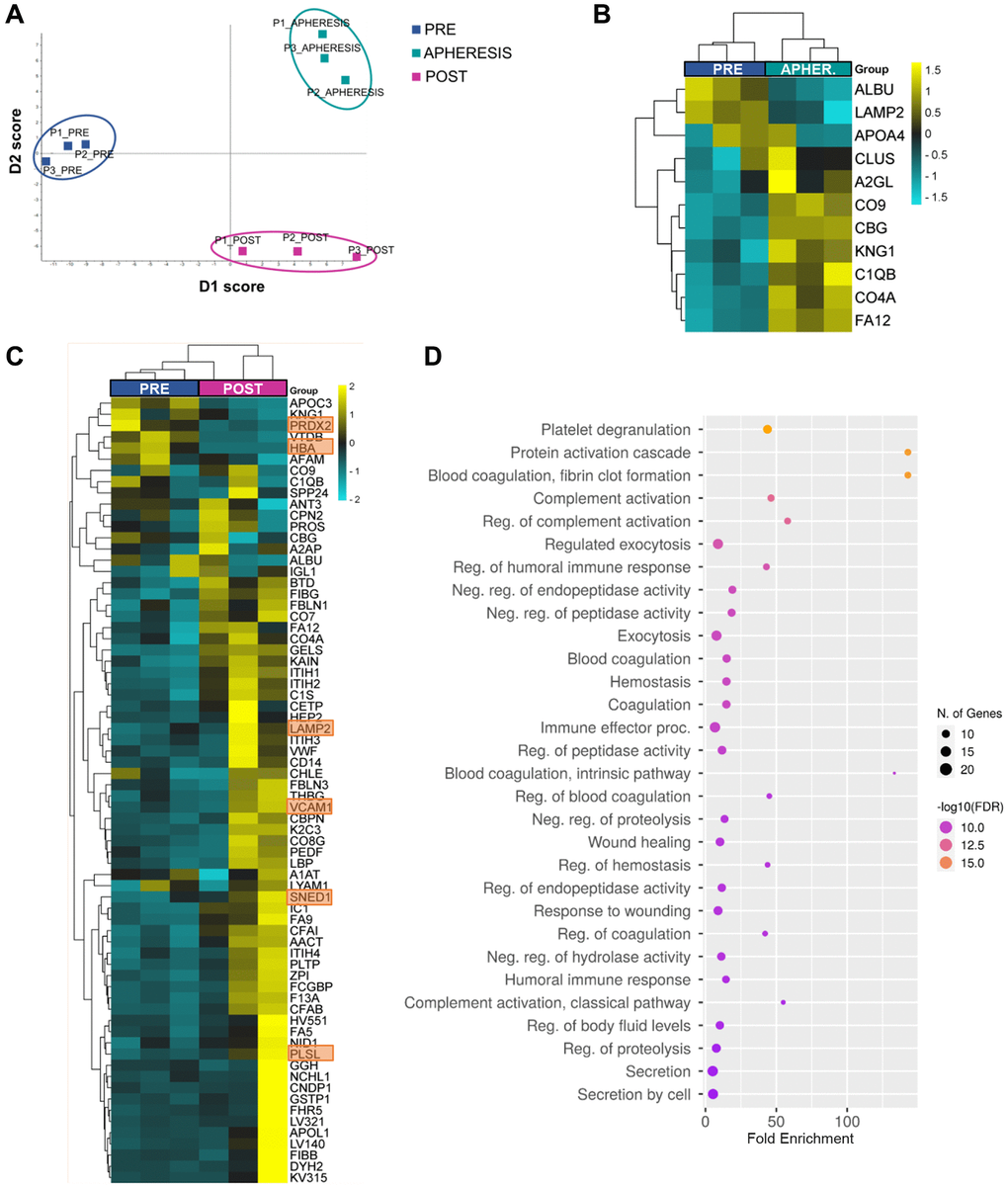 A quantitative proteomic approach using SWATH™ was applied to analyze the proteomic profiles of plasma from PRE, APHERESIS, and POST samples.