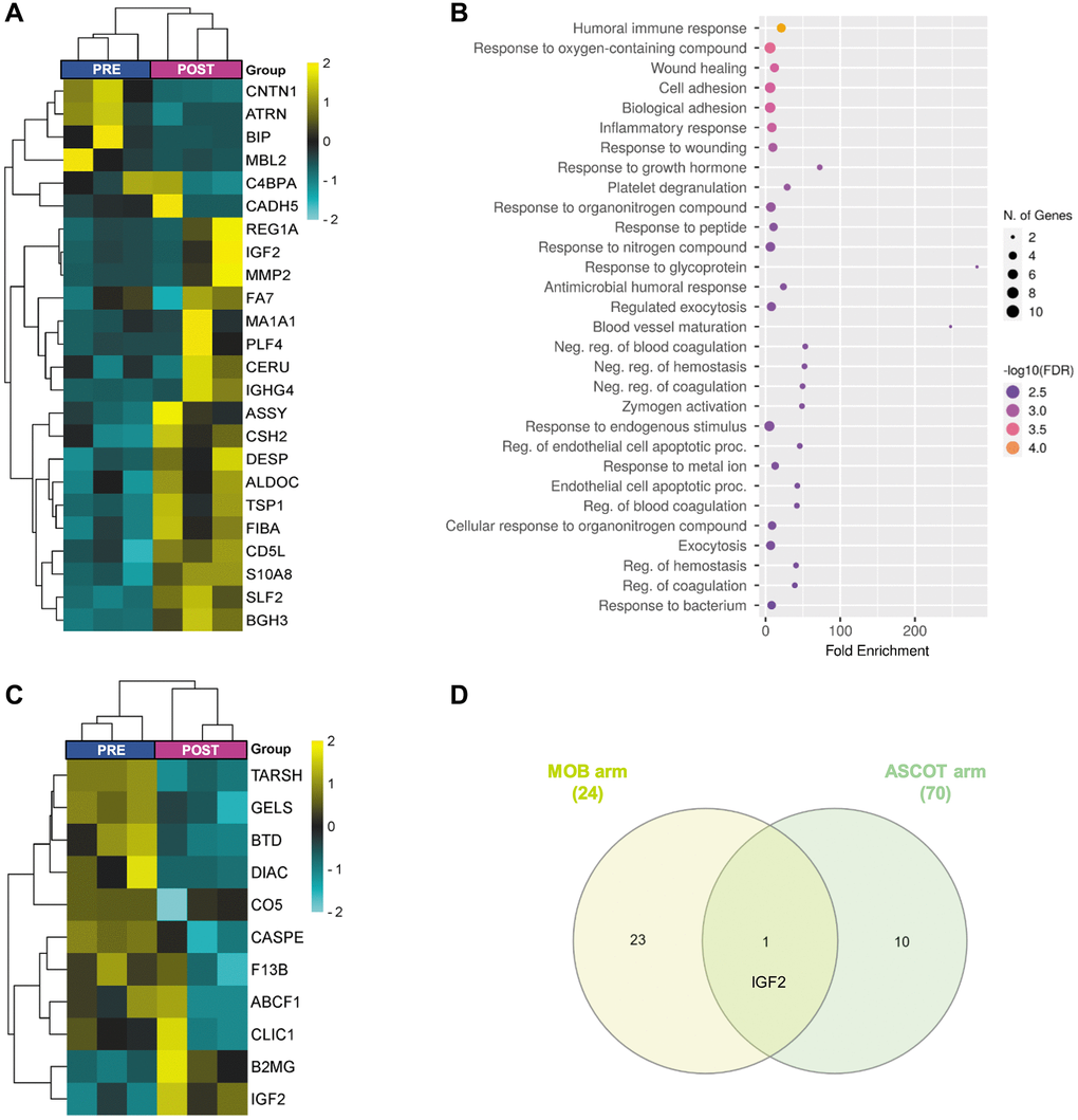 These samples were also clearly differentiated (Figure 2A), although only 11 DEPs were identified (Figure 3C, Supplementary Table 9), and no significantly associated GO Biological Processes were found. Nevertheless, amidst these DEPs, we found the di-N-acetylchitobiase (DIAC) whose plasma levels increase with aging [11] and was downregulated after ASCOT.