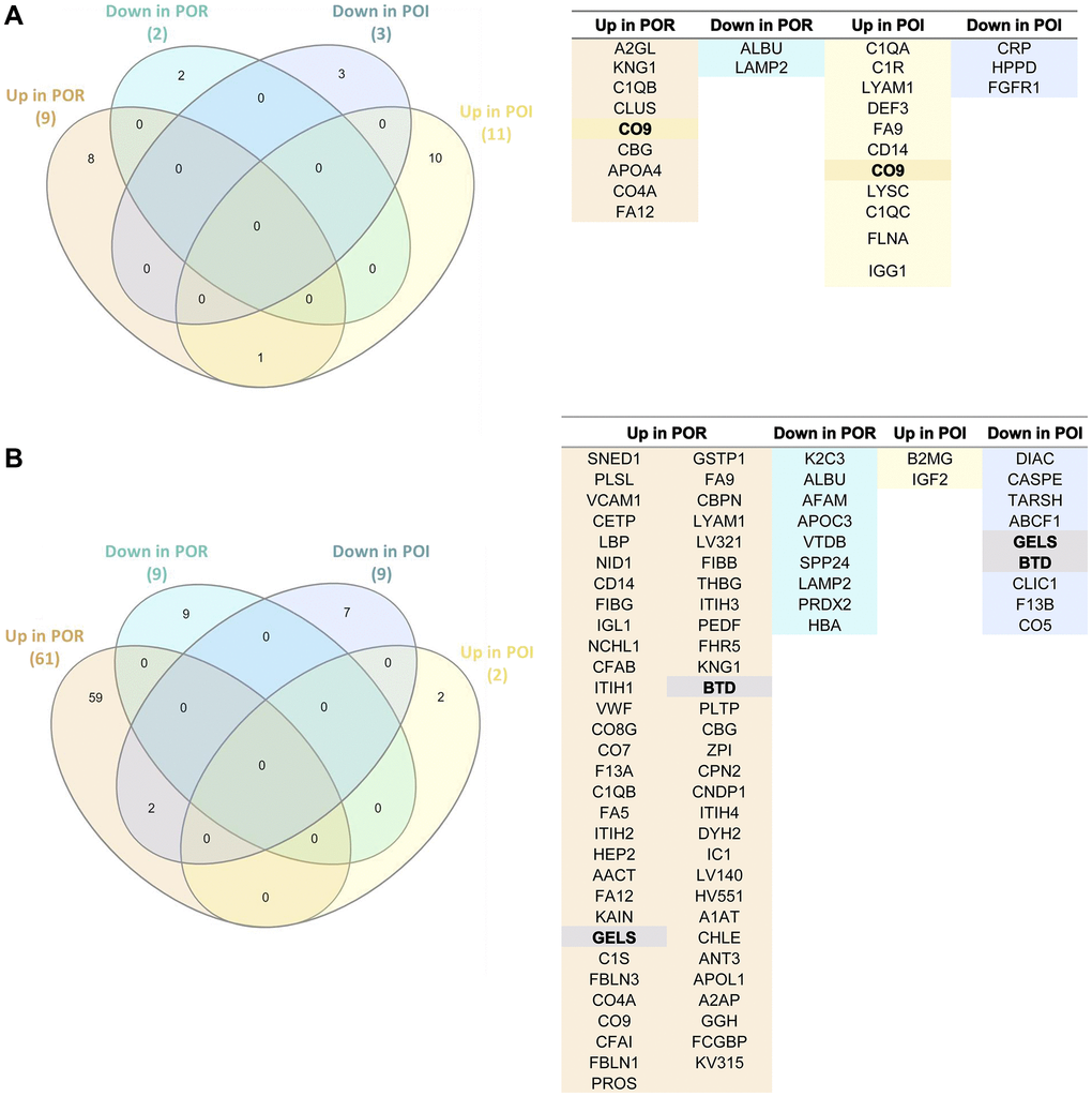 The stem cell infusion procedure also induced different systemic changes between patients with POR and POI patients from the ASCOT arm (with cell infusion), as shown in Figure 4B. In fact, the only two shared DEPs following stem cell injection were biotinidase (BTD) and gelsolin (GELS), which were upregulated in POR and downregulated in POI patients.
