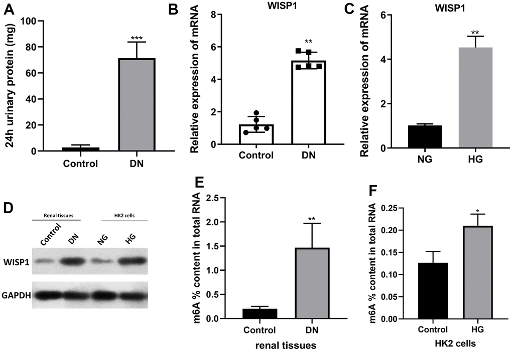 To explore possible key genes in DN development, we first constructed DN mouse model with 40mg/kg streptozotocin. The 24 h urinary albumin of DN mouse was significantly higher than that of control group (1A). That indicated successful diabetic nephropathy modeling. And qRT-PCR data denoted that the level of WISP1 in the DN group was notably increased relative to that in the control group (Figure 1B). Then HK2 cells were induced by HG. And the data revealed that the level of WISP1 in the HG group was obviously elevated compared with that in the NG group (Figure 1C). The expression of WISP1 in renal tissues and HK cells were also to be confirmed at protein levels (Figure 1D). Thus, this result presented that the upregulation of WISP1 might be associated with DN. The proportion (%) of m6A in total RNA was calculated. This data confirmed that the total levels of m6A methylation were higher in DN group than those in control group (Figure 1E). Similar results were also found in cell model. The proportion (%) of m6A in total RNA was increased significantly in HG group (Figure 1F).