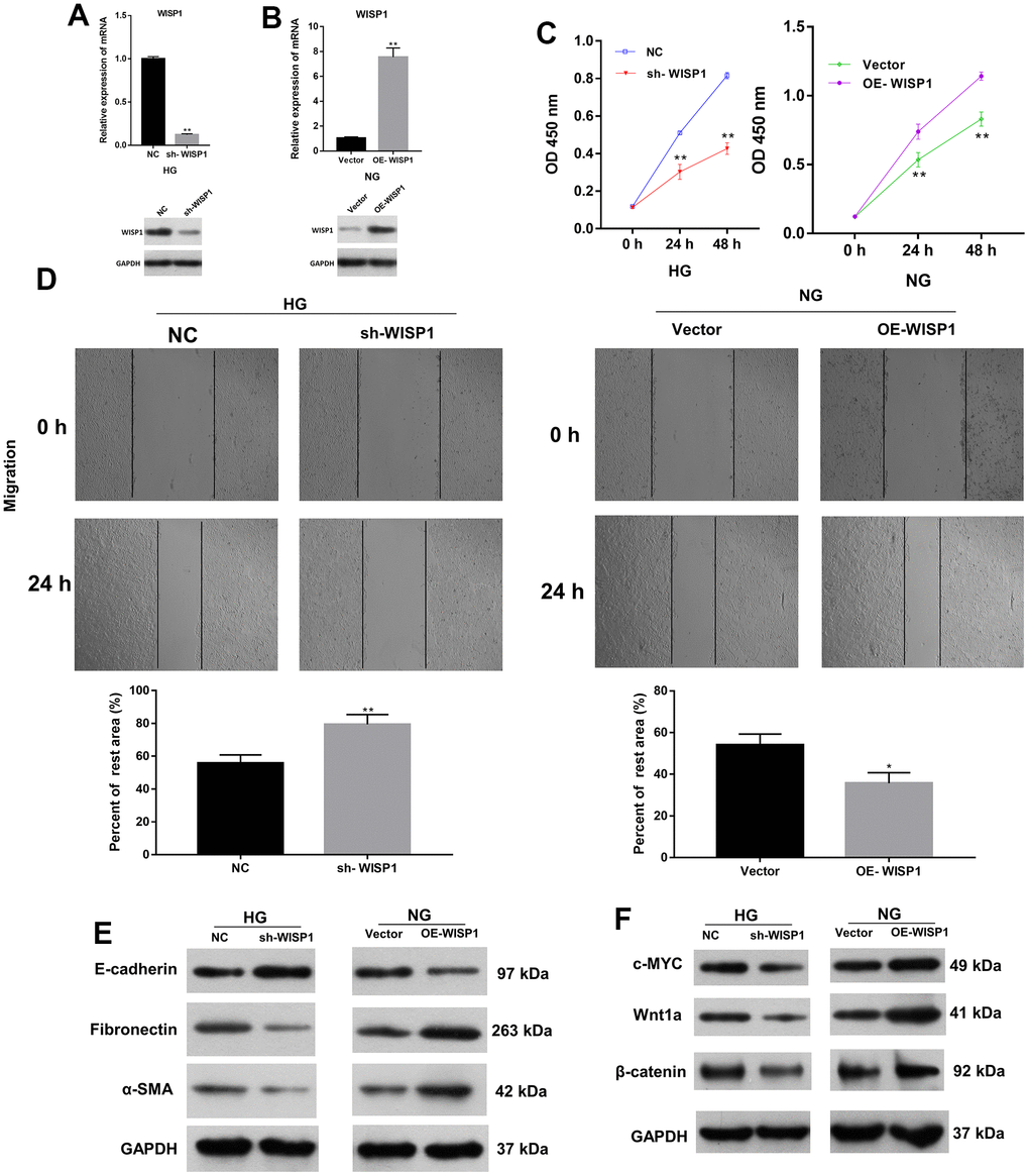 On the basis of the above results, we ulteriorly verified the roles of WISP1 in HG-induced HK2 cells through a series of experiments. We first adopted qRT-PCR to evaluate the transfection effect of WISP1-silenced HG-induced HK2 cells and WISP1-overexpressed HK2 cells. As expected, in HG-induced HK2 cells, the level of WISP1 in the silencing group was prominently degraded relative to that in the NC group (Figure 2A). And in HK2 cells, the level of WISP1 in the overexpression group was memorably boosted relative to that in the vector group (Figure 2B). This implies that WISP1 has been successfully silenced in HG-induced HK2 cells or overexpressed in HK2 cells. Then the result of CCK-8 displayed that the proliferation of HG-treated HK2 cells was notably decreased in sh-WISP1 group in comparison with NC group, and the proliferation of HK2 cells was prominently enhanced in OE-WISP1 group compared to vector group (Figure 2C). Correspondingly, the result of wound healing exhibited that the migration ability of HG-treated HK2 cells dramatically decreased after WISP1 silencing, and upregulation of WISP1 observably promoted the migration ability of HK2 cells (Figure 2D). Furthermore, to investigate the relationship between EMT process and WISP1, we applied western blot to monitor the expression levels of EMT associated proteins. The results manifested that WISP1 silencing markedly upregulated E-cadherin, and downregulated a-SMA and Fibronectin in HG-treated HK2 cells, and WISP1 overexpression group had the opposite effects on the expression of these proteins in HK2 cells (Figure 2E). It is well known that EMT is typically characterized by suppression of E-cadherin, facilitation of Fibronectin and a-SMA expressions. So, we revealed that WISP1 overexpression could induce EMT of HK2 cells. Cell fibrosis is typically characterized by encouragement of Wnt1a, c-MYC and β-catenin expressions. Western blot results further disclosed that WISP1 silencing observably decreased c-MYC, Wnt1a, and β-catenin expressions in HG-treated HK2 cells, and WISP1 overexpression notably induced cell fibrosis in HK2 cells (Figure 2F). In short, we demonstrated that WISP1 could induce the development of DN.