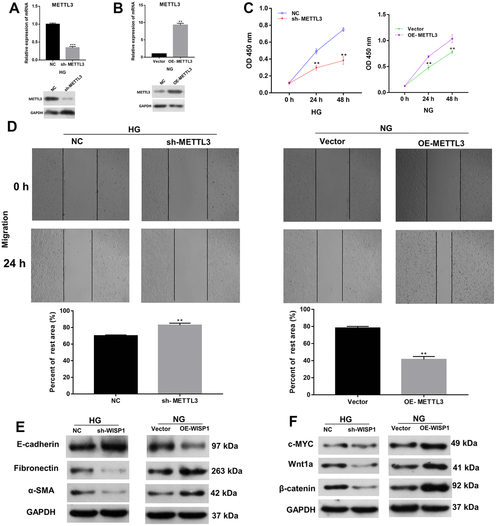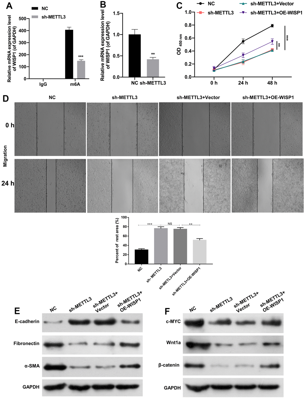 Moreover, we further verified the moderating relationship between WISP1 and METTL3. And MeRIP-quantitative real-time PCR exhibited that WISP1 m6A modification was notably decreased after METTL3 silencing (Figure 4A). Then we discovered that METTL3 silencing also could notably downregulate WISP1 in HG-induced HK2 cells (Figure 4B). Next, we also confirmed the effects of WISP1 and METTL3 on cell-related functions by the rescue experiment. And HG-treated HK2 cells were co-transfected with sh-METTL3 and WISP1 overexpression plasmid. CCK-8 results displayed that silencing of METTL3 suppressed proliferation of HG-treated HK2 cells, while upregulation of WISP1 dramatically reversed the inhibition effect of METTL3 silencing on cell proliferation (Figure 4C). Similarly, the trend of cell migration was consistent with that of cell proliferation from CCK-8 results (Figure 4D). Besides, western blot results revealed that silencing of METTL3 dramatically upregulated E-cadherin, and downregulated a-SMA and Fibronectin in HG-treated HK2 cells, which also could be remarkably reversed by WISP1 overexpression (Figure 4E). Meanwhile, we testified that the downregulation of c-MYC, Wnt1a, and β-catenin mediated by METTL3 silencing also could be prominently restored by WISP1 overexpression in HG-treated HK2 cells (Figure 4F). Thus, we proved that METTL3 silencing could reduce WISP1 m6A modification, and silencing of METTL3 also could inhibit the degradation process of HG-treated HK2 cells by downregulating WISP1.