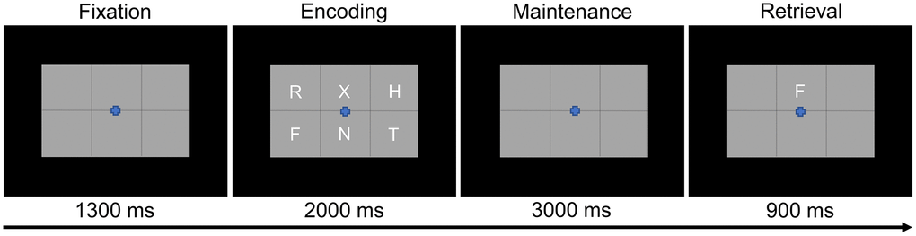 Participants were shown a centrally-presented fixation cross embedded in a 3 × 2 grid for 1.3 s (Figure 1). An array of six consonants then appeared at fixed locations within the grid for 2.0 s (i.e., encoding phase). Following the encoding phase, the letters disappeared and the empty grid remained on the screen for 3.0 s (i.e., maintenance phase). Finally, during the retrieval phase, a single probe consonant then appeared in the grid for 0.9 s, and the participant was instructed to respond via button press with their right index or middle finger as to whether the probe was in or out of the previous array of letters. A total of 128 trials were completed, equally split and pseudorandomized between in- and out-of-set trials, for a total run time of about 15 min. This task has been utilized in several previous studies from our laboratory [16, 17, 41–44].