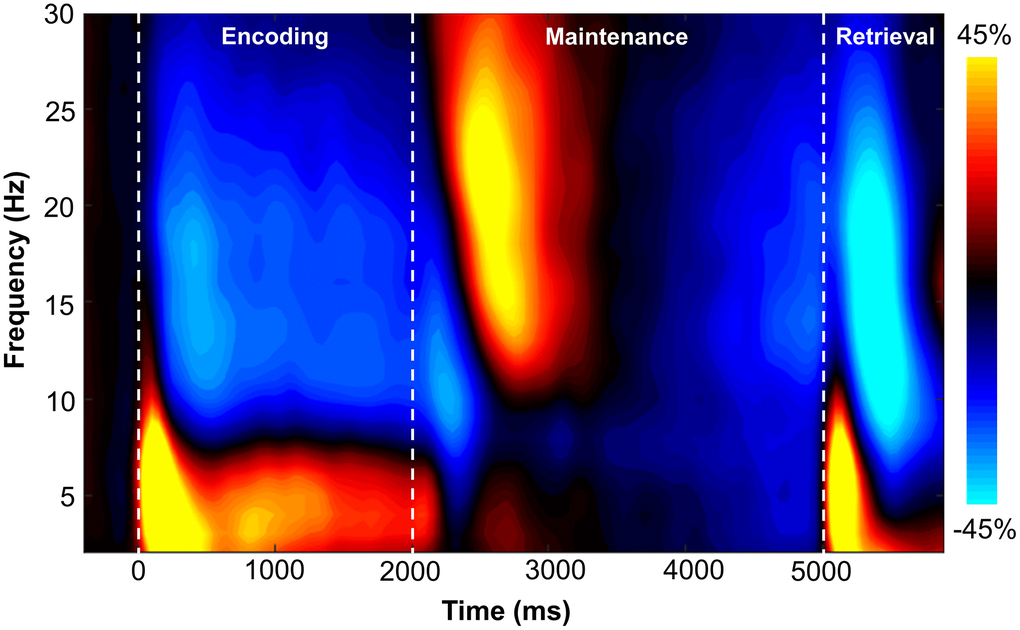 Working memory (WM) is a fundamental executive process which involves the storage, maintenance, and manipulation of relevant information. WM processes are generally grouped into three phases: information encoding, maintenance, and retrieval. The maintenance phase, which involves the rehearsal of the encoded information and the active inhibition of any new sensory stimuli, is the defining component which differentiates WM from other types of memory. Multiple studies have shown that WM processes are supported by a combination of neural spiking and oscillatory activity in the frontal and posterior cortices [1–8]. Historically, the neurophysiological underpinnings of WM function have been primarily investigated using functional MRI (fMRI). Such studies have revealed a left dominant, bilateral WM network with converging nodes in the dorsolateral prefrontal cortex (dlPFC), inferior frontal gyri, parieto-temporal cortices, and occipital regions [9–11]. More recently, electrophysiological studies have helped illuminate the specific oscillatory dynamics underlying WM function. Specifically, theta band activity during WM performance has been associated with the encoding of visual stimuli in primary visual cortices and higher-order cognitive control in the prefrontal cortex (PFC) [8, 12–14]. Similarly, alpha and beta band activity has been associated with higher-order visual processing in the posterior cortices and cognitive control in the PFC [14–17].