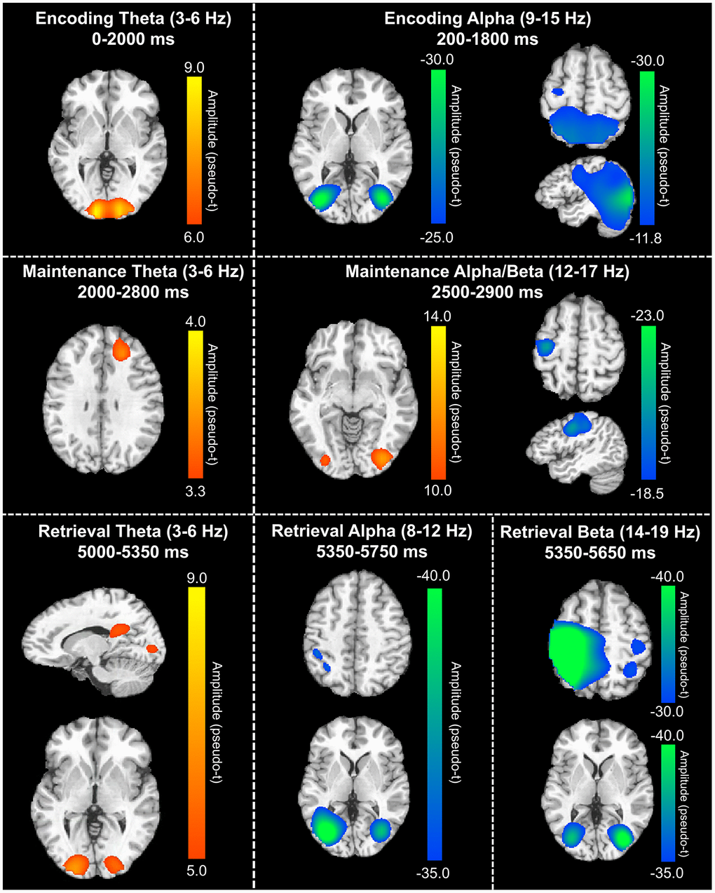Sensor-level time-frequency analysis across all participants revealed significant clusters (p < .001, corrected) of theta, alpha, and beta band oscillatory activity during the encoding, maintenance, and retrieval phases (Figure 2). During the encoding phase, theta band (3-6 Hz) activity sharply increased immediately following stimulus presentation (i.e., 0 ms), continued through the encoding phase, and slowly dissipated over the first 800 ms of the maintenance phase (i.e., 3-6 Hz, 0-2800 ms; p < .001, corrected). Additionally, decreases in alpha band (9-15 Hz) activity began around 200 ms after the onset of the encoding grid and were sustained throughout the encoding phase, terminating near the beginning of the maintenance phase (i.e., 9-15 Hz, 200-1800 ms; p < .001, corrected). During the maintenance phase, there was a significant cluster of increased alpha/beta activity in a slightly higher frequency band (12-17 Hz; 2500-2900 ms; p < .001, corrected). During the retrieval phase, an increase in theta activity followed retrieval probe presentation (3-6 Hz; 5000-5350 ms; p < .001, corrected). Finally, overlapping decreases in alpha (8-12 Hz; 5350-5750 ms) and beta (14-19 Hz; 5250-5650 ms) band activity were observed during the retrieval phase (both ps < .001, corrected).