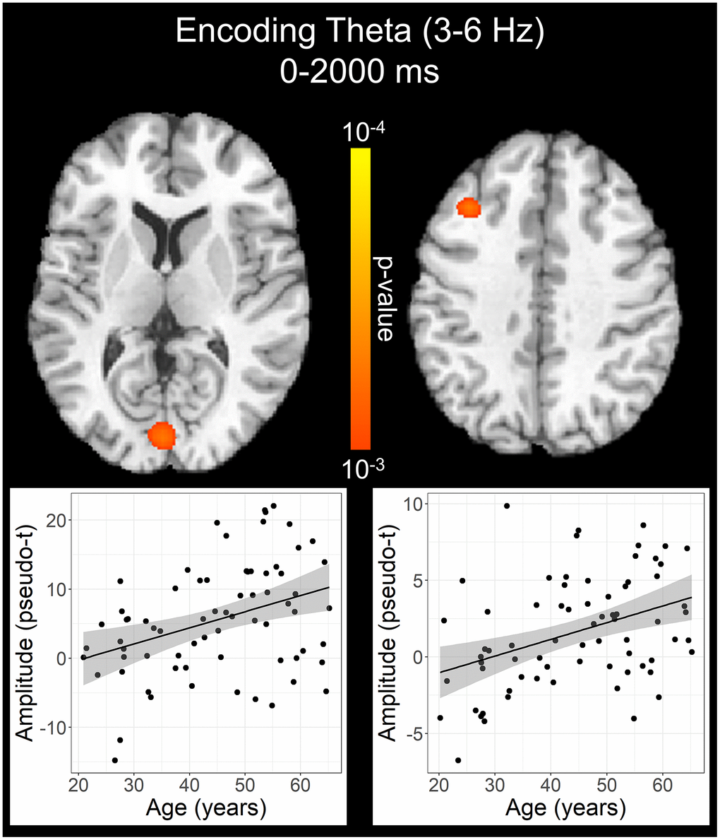 After imaging, average whole-brain maps were computed across all participants for the selected time-frequency windows. These 3D maps of brain activity were used to assess the neuroanatomical basis of the significant oscillatory responses identified through the sensor-level analysis. Finally, these source images were subjected to correlation analyses with age to investigate how the oscillatory processes underlying WM encoding, maintenance, and retrieval change as a function of age. To control the multiple comparisons inherent to whole-brain voxel-wise statistics, cluster-based permutation testing was again utilized [50, 51, 56]. This whole-brain cluster-based permutation testing was virtually identical to the approach used for sensor-level statistics (see above), with the exception that the input data was voxel-level neural responses and we used a different statistical threshold following permutation testing (i.e., stage one threshold of p < .001; threshold of p < .05 following permutation testing for multiple comparisons correction).