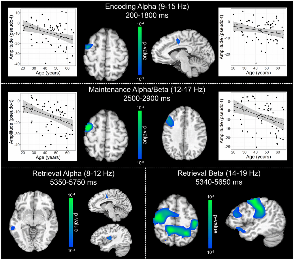 Taken together, these data support the previous literature showing greater recruitment of the prefrontal cortex in older individuals during WM performance. Importantly, our findings extend this literature by demonstrating that age-related hyperactivation of prefrontal regions occurs in all phases of WM (i.e., encoding, maintenance, and retrieval) and is multispectral involving theta, alpha, and beta oscillatory activity. Further, though the age-related changes in alpha and beta band activity were restricted to prefrontal executive control regions during the encoding and maintenance phases, these age-related changes emerged in a more widespread network that included language (i.e., phonological loop) and motor regions during the retrieval phase. Developing a better understanding of these age-related alterations in WM function may have important implications for developing targeted interventions aimed at improving cognitive function and promoting healthy aging across the lifespan.