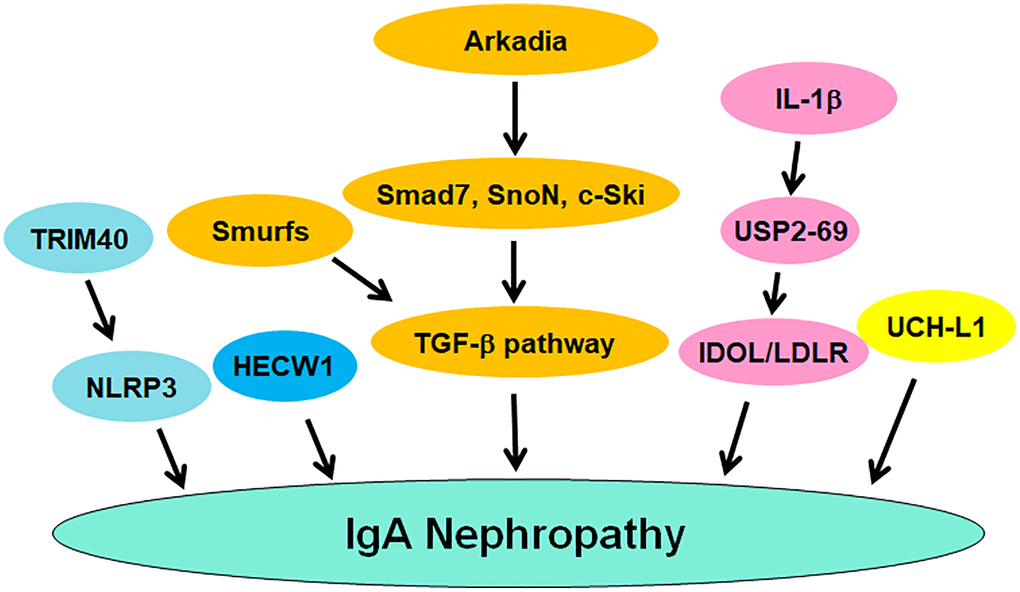 Arkadia is a RING-type E3 ubiquitin ligase and has been identified to regulate the TGF-β signaling pathway. One group reported that Arkadia promoted the ubiquitination and degradation of Smad7, SnoN and c-Ski, conferring to activation of TGF-β signaling pathway [110]. Another group found that Arkadia, Smurf2, and c-Ski could be key regulators in TGF-β signaling and serve as potential targets for cardiac fibrosis [111]. It is known that TGF-β1/Smad signaling has a significant role in renal tubular injury and glomerular sclerosis in IgAN children [112]. One study validated that Arkadia activated TGF-β signaling via governing the degradation of Smads, contributing to TGF-β-mediated IgA expression in IgAN [113]. Interestingly, Smurfs E3 ligases exhibited the opposing effects of Arkadia in TGF-β-involved IgA isotype expression [114]. Upregulation of Smurf1 and Smurf2 attenuated GLα promoter activities induced by TGF-β1, and inhibited Smad7 promoter activity. Increased Smurf1 and Smurf2 reduced Smad3/4-induced and Runx3-induced GLα promoter activities. Smurfs blocked TGF-β pathway and inhibited the expression of GLα. Upregulation of Smurf1 reduced TGF-β-involved IgA secretion. Upregulation of Arkadia abrogated the suppressive function of Smad7 on TGF-β-mediated IgA secretion and GLα expression. All in a word, Arkadia degraded Smad7 and promoted TGF-β-mediated IgA secretion, whereas Smurf1 abolished this effect [114].