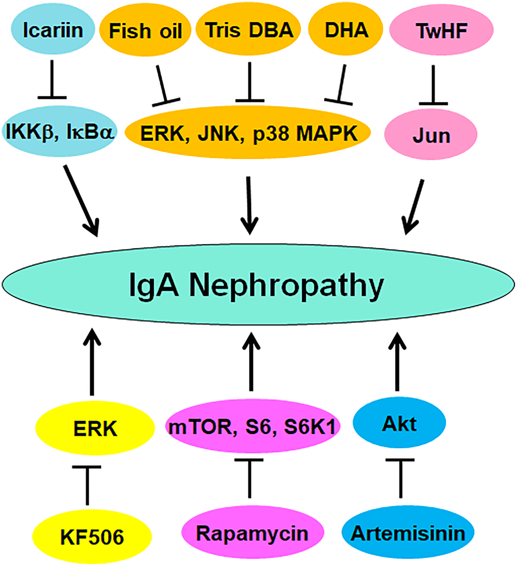 Accumulated evidence has demonstrated that numerous compounds can target protein phosphorylation to regulate the progression of IgAN (Table 1). IgAN rats displayed higher expression of p70S6K and phosphorylation of Akt and S6. Rapamycin, a mTOR inhibitor, reduced the expression of p70S6K and phosphorylation of S6, resulting in reduction of proteinuria, IgA deposition, which protected renal function in IgAN rats. Targeting Akt/mTOR/p70S6K by rapamycin might be a good option for IgAN therapy [146]. Rapamycin increased autophagy and suppressed the phosphorylation of mTOR and S6K1 and reduced the expression of cyclin D1 in IgAN rats [147]. Tris DBA, a palladium complex, was found to ameliorate IgAN via inactivation of NLRP3 inflammasome and promotion of autophagy induced by SIRT1 and SIRT3. Tris DBA treatment in IgAN mice inhibited phosphorylation of ERK, p38 MAPK and JNK, suppressed ROS generation, contributing to improving kidney functions and albuminuria [148]. TwHF (tripterygium wilfordii Hook F), a compound for treating IgAN patients in China, inhibited phosphorylation of JUN and alleviated renal injury in the renal of IgAN mice [149].