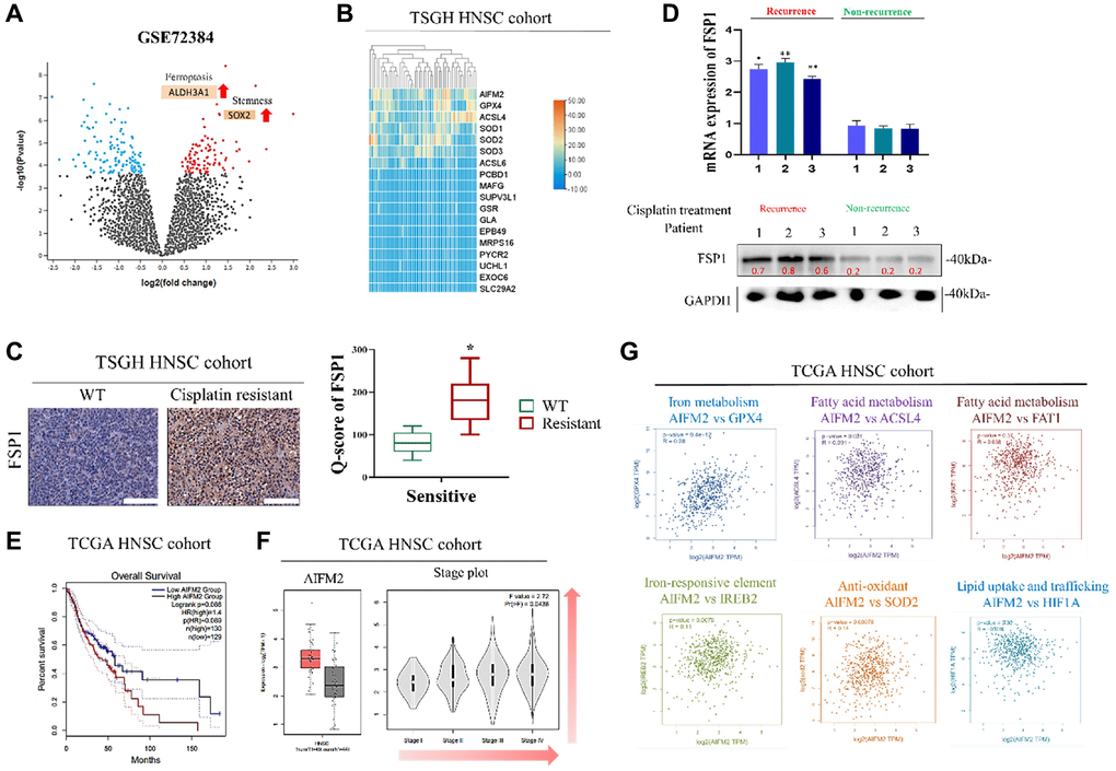 Surgical-residual tissue samples of 50 patients with cisplatin-resistant HNSCC were collected from Tri-Service General Hospital (TSGH) to research the expression of FSP1’s upstream and downstream targets. This study was approved by the Institutional Review Board of TSGH and was conducted in accordance with the recommendations of the Declaration of Helsinki for biomedical research (IRB:2-108-05-124). After informed consent was obtained, tissue samples were obtained from the TSGH tissue archive and retrospectively studied. We assessed the expression of FSP1 in a cohort of 50 individuals with head and neck squamous cell carcinoma (HNSCC), comprising 45 males and 5 females, aged between 29 to 75 years, with a median age of 52 years. The tissue specimens for this study were gathered from January 2015 to July 2020. Before treatment commenced, patients underwent comprehensive evaluations that included a thorough clinical history, a physical examination, a barium swallow X-ray, an endoscopy of the upper gastrointestinal tract, and CT scans of both the chest and abdomen. Treatment for all individuals was administered in accordance with the established protocols of TSGH and the NCCN guidelines. Tissue arrays were constructed using tissue samples from 50 participants: 25 normal and 25 recurrent HNSCC tissue samples. FSP1 expression in recurrent HNSCC was determined through immunohistochemical (IHC) staining of the tissue arrays. Antibodies against FSP1 (1:200; 20886-1-AP; Abcam, Waltham, MA USA) were used by following the standard IHC staining protocol and with a similar dilution of mouse immunoglobulin G as that of the negative control. FSP1 expression was analyzed by two independent pathologists. FSP1 immunoreactivity was calculated using the quick score (Q score) method (Q = P × I); the percentage distribution (P) of FSP1-stained tumor cells was scored from 0% to 100%, the intensity (I) of FSP1 expression was scored using a 4-point scale (3, strong staining; 2, moderate staining; 1, weak staining; and 0, no staining), and total scores ranged from 0 to 300. The feed-forward loop of oncogenic activities involved in the regulation of FSP1 and its clinical implications was investigated. This study also analyzed the expression of FSP1 and related genes in head and neck cancer by using datasets from The Cancer Genome Atlas (TCGA) and Gene Expression Omnibus (https://www.ncbi.nlm.nih.gov/geo/) databases. Expression Project for Oncology (expO) integrates gene expression data with longitudinal clinical annotations to elucidate human malignancies and provide critical insight into diagnostic markers, prognostic indicators, and therapeutic targets.