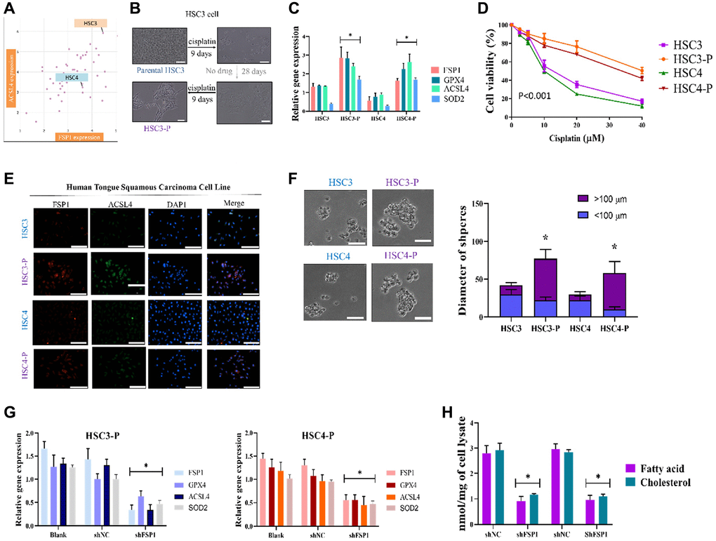 We first established human tongue squamous cell carcinoma cell lines HSC3 and HSC4 DTP cancer cells that could tolerate cisplatin. Two kinds of human tongue squamous carcinoma cell lines were purchased from Merck (HSC-3, SCC193, USA) and AcceGen Biotechnology (HSC-4, ABC-TC0420, USA). Figure 2A presents the analysis of the expression of FSP1 and ACSL4 in the HNSCC cell line. We used the depmap online tool to investigate the vulnerabilities of cancer and identify targets for therapeutic development (https://depmap.org/). The findings indicate that HSC3 and HSC4 cell lines are relevant to the expression of AIFM2 and ACSL4 and can be utilized in this study. Out of the two cell lines, HSC3 exhibits a greater expression of AIFM2 compared to HSC4. It is hypothesized that following Cisplatin treatment, more pronounced differences could be observed, and HSC3 will serve as a research sample for subsequent ferroptosis studies. HSC3 was used as the experimental cell line in this study, and HSC4 was used as the control cell line. Subsequently, we generated drug-tolerant persister cells from these two cell lines. HNSCC cancer cell lines were treated for approximately 9 days with a cytotoxic concentration of cisplatin (5 μM; Figure 2B). The results revealed that a small fraction of HNSCC cancer cells (3%–5%) entered a quiescent (persister) state to evade the strong selective pressure of high-concentration cisplatin (Figure 2B, upper right panel). We assessed whether these persister cells were consistent with the reported observation of a reversible state of drug resistance. Removal of cisplatin (the cells were cultured in cisplatin-free media for >28 days) allowed the persister cells to regrow (Figure 2B, lower right panel). Subsequent cisplatin treatment led to persister cells being derived again and indicated that these cells had reacquired sensitivity to cisplatin (Figure 2B, lower left panel). The reversibility of drug resistance in HNSCC cancer persister cells, which has also been reported in HSC3 persister cell models, is indicative of a resistance mechanism. Relative gene expression assay findings indicated higher expression of FSP1, GPX4, and ACSL4 in cisplatin-DTP cell lines (presented in Figure 2C). The rederived persister cells were discovered to be sensitive to cisplatin. These cells are named cisplatin-DTP cells and further annotated as HSC3-P and HSC4-P. The results indicated that the persister cells were considerably more resistant to cisplatin than were their parental cells (Figure 2D). We compared DTP and non-DTP cell line functional phenotypes. In cell immunostaining, we found abnormal expression of FSP1 and ACSL4 in both DTP cell types (Figure 2E). The DTP cell phenotypes were characterized by poor migration and high drug resistance. As previously reported, DTP HNSCC cell lines have strong stemness properties, indicated by greater diameters of formed spheres (Figure 2F). The relative gene expression survey of FSP1, GPX4, and ACSL4 with and without shFSP1 transfection is presented in Figure 2G. In an effort to provide more concrete evidence of the crucial role played by FSP1 in the regulation of lipid metabolism in head and neck squamous cell carcinoma (HNSCC) drug-tolerant persisters (DTP) cells, we conducted a detailed analysis focused on the effects of FSP1 knockdown on the metabolic pathways within these cells. Specifically, we targeted the FSP1 gene for silencing and subsequently monitored the resultant changes in lipid metabolism. The data obtained from this investigation was quite telling; it demonstrated a marked reduction in the cellular concentrations of key lipid constituents, namely fatty acids and cholesterol. These findings are critical as they suggest that FSP1 is a significant regulator of lipid metabolism in these cancer cells. The observed downregulation of lipid components following FSP1 suppression could have profound implications for the metabolic state and viability of the HNSCC DTP cells. This pivotal data is comprehensively illustrated in Figure 2H, where a clear visual representation of the reduced lipid levels post-FSP1 silencing is presented.
