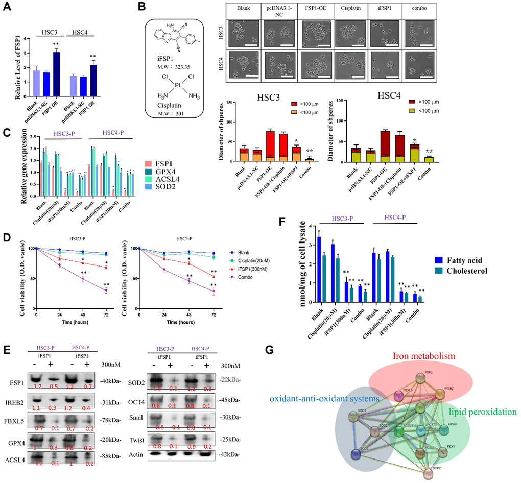 To elucidate the role of FSP1 in conferring drug resistance, we performed a thorough investigation on two HSC cell lines. Using pCDNA 3.1 as our expression vector, we successfully overexpressed FSP1 in these cells, with confirmation of this overexpression demonstrated in Figure 3A. A subsequent cell migration assay provided evidence that FSP1 overexpression enhances the motility of HSC cells, an effect that was not mitigated by treatment with cisplatin. Interestingly, the introduction of an FSP1 inhibitor not only reduced cell migration but also allowed cisplatin to exhibit a more potent inhibitory effect on the migration rate, as shown in Figure 3B. Furthermore, RNA analysis of the HSC DTP cell lines, which show persistent cisplatin resistance, revealed atypical expression patterns of genes implicated in ferroptosis (FSP1), fatty acid metabolism (ACSL4), and cellular antioxidation (SOD2). This dysregulated gene expression profile was normalized upon the application of an FSP1 inhibitor, suggesting a reversal of the resistant phenotype, as depicted in Figure 3C. The alteration in gene expression correlating with cellular responses was further supported by cell viability assays, confirming these observations, as seen in Figure 3D. Delving deeper into the effects of FSP1 inhibition on the biological characteristics of HNSCC-DTP cells, including their stemness, invasive capacity, and metastatic potential, we employed immunoblotting techniques. This allowed us to dissect the downstream protein expression related to ferroptosis regulation. The findings presented in Figure 3E shed light on the potential molecular mechanisms by which FSP1 modulates these characteristics in DTP cells. To affirm FSP1’s role in lipid metabolism in HNSCC DTP cells, we scrutinized the consequences of FSP1 suppression on lipid-related cellular activities. The results unambiguously indicated that silencing FSP1 leads to a significant reduction in the intracellular concentration of fatty acids and cholesterol, as illustrated in Figure 3F. This supports the hypothesis that FSP1 is integral to the proper regulation of lipid metabolism. Lastly, Figure 3G presents a comprehensive overview of the putative regulatory network of ferroptosis within the cell, highlighting three intertwined pathways: ferroptosis itself, fatty acid metabolism, and cellular antioxidation. This diagram serves to visualize the complex interactions and regulatory mechanisms that may be affected by the perturbation of FSP1 activity within these cells, further emphasizing its pivotal role in cellular metabolism and drug resistance phenomena.