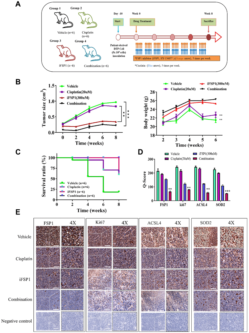 We evaluated the therapeutic effects of iFSP1 by creating a patient-derived xenograft mouse model through orthotopic inoculation with patient-derived tumor cells. Patient-derived tumor cells were injected into the right flank of NOD-SCID female mice for in vivo validation of the findings in the in vitro study. The mice were divided into four groups: vehicle control, cisplatin alone (orally five times per week), iFSP1 alone (orally five times per week), and the combination of both drugs (combining both regimens), respectively. A flowchart showing the in vivo experimental design and treatment schedule is presented in Figure 4A. The tumors that developed in the mice receiving the combination treatment were markedly smaller at the indicated time points than those that developed in the control mice, with a 1.6-fold difference in tumor size by week 8 (p < 0.01). However, no significant effect on mouse bodyweight at week 6 was observed (Figure 4B). Furthermore, the mice in the combination treatment group had a considerably higher survival rate than those in the other groups (Figure 4C). Using tumor samples derived from the tumor xenograft mouse model, we demonstrated that the expression of FSP1, ki67, SOD2, and ACSL4 proteins was significantly suppressed in the FSP1 inhibition and combined treatment groups compared with that in the control group. The Q score of tissue staining was also calculated. The findings indicated that FSP1 plays a crucial role in the malignant progression of HNSCC and in the modulation of markers (Figure 4D, 4E).
