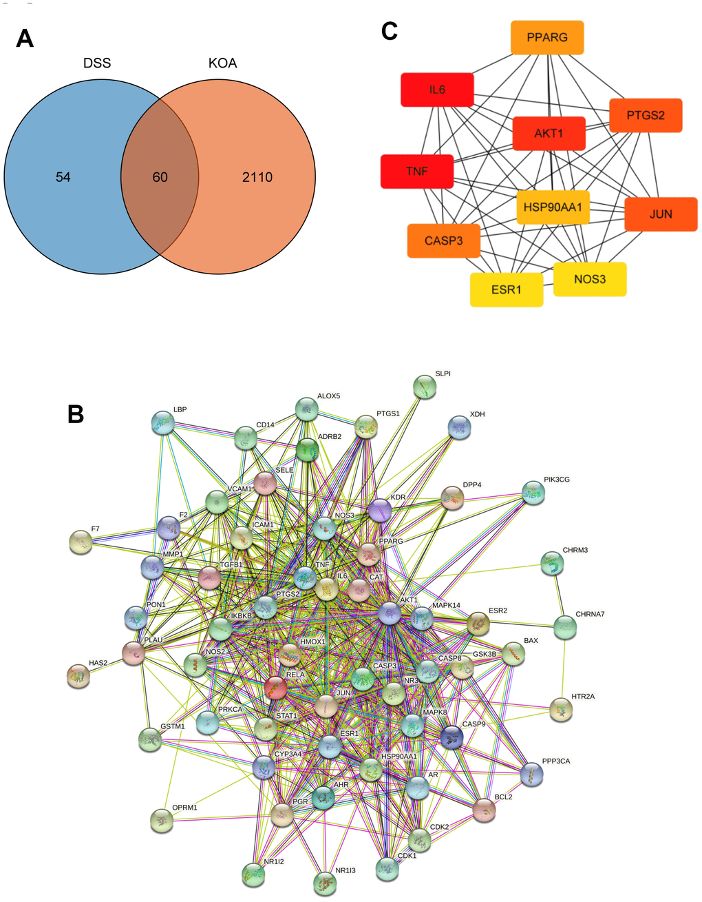 In total, 51 bioactive ingredients were identified from the TCMSP database based on the screening criteria, and 114 related targets were obtained after removing duplicates. Meanwhile, a total of 2170 targets associated with KOA were obtained from GeneCards and DisGeNet databases after integration and deduplication. As shown in Venn diagram (Figure 1A), there were 60 targets that overlapped between the DSS ingredients and KOA-related targets. The PPI network was composed of 60 nodes and 550 edges, the average node degree was 18.3 (Figure 1B). By using the CytoHubba plugin, 10 genes with the highest degree were selected as hub genes that may play an important role in the treatment of KOA with DSS, including IL6, TNF, AKT1, PTGS2, JUN, CASP3, PPARG, HSP90AA1, NOS3, and ESR1 (Figure 1C).