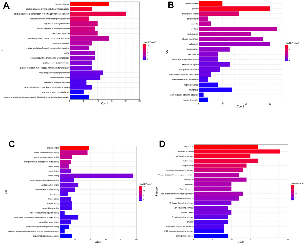 Candidate targets were submitted to the DAVID database (https://david.ncifcrf.gov/) [18] to perform Gene Ontology (GO) and Kyoto Encyclopedia of Genes and Genomes (KEGG) pathway enrichment analysis. The GO enrichment analysis consists of molecular function (MF), biological process (BP), and cellular component (CC). The results of the enrichment analysis were presented with a bar chart using an online webtool.