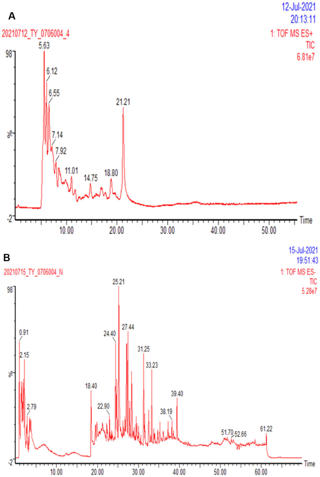 High-performance liquid chromatography (HPLC) analysis was performed using a Waters Synapt G2-Si quadrupole time-of-flight mass. The chromatographic separations of DSS were performed on an Acquity UPLC HSS T3 column at 35° C, with a mobile-phase flow rate of 0.25 mL/min. The injection volume was 20 μL. The mobile phase consisted of deionized water containing 0.1% formic acid (A) and acetonitrile containing 0.1% formic acid (B) with the following gradient elution: 0–15 min, 100% A; 15–50 min, 80% A and 20% B; 50–70 min, 100% B; 70 min, 100% A.