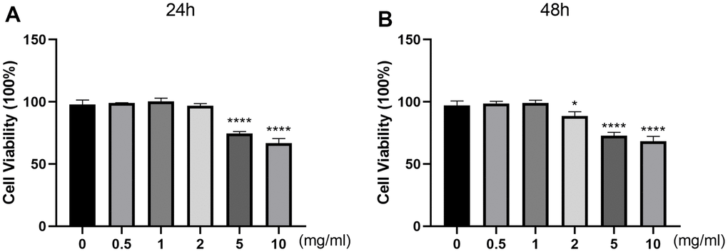 To evaluate the cytotoxic effect of DSS on the viability of chondrocytes, cells were treated with different concentrations of DSS for 24 h or 48 h, followed by the CCK-8 detection. As shown in Figure 4A, DSS at the concentrations of 0.5, 1, 2 mg/mL exerted no cytotoxicity to chondrocytes, while high concentrations (5 and 10 mg/mL) of DSS reduced cell viability significantly. As shown in Figure 4B, DSS treatment at the concentrations of 0.5 and 1 mg/mL did not affect the viability of chondrocytes. Based on this, DSS at concentrations of 0.5 and 1 mg/mL were used in further experiments.