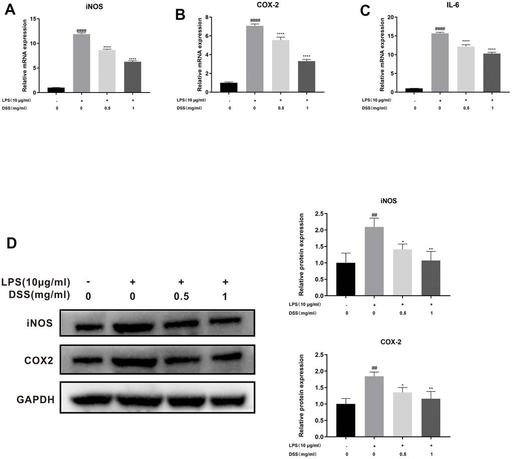 Subsequently, we assessed the effect of DSS on LPS-induced chondrocyte inflammation by qRT-PCR and Western blot analysis. As shown in Figure 5A–5C, qRT-PCR results showed that the mRNA expression of iNOS, COX-2, and IL-6 were upregulated after LPS stimulation. However, DSS treatment dramatically suppressed the production of iNOS, COX-2, and IL-6 in a concentration-dependent manner. Similarly, in line with the qRT-PCR results, the western blot analysis also confirmed that DSS treatment concentration-dependently inhibited the inflammation-related protein levels of iNOS and COX-2 (Figure 5D). Taken together, these results suggest that DSS could decrease the production of inflammatory cytokines at the concentration of 0.5 and 1 mg/mL.