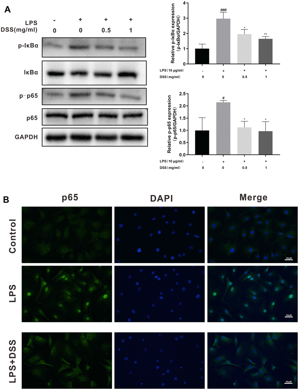 To further explore the potential mechanism of the anti-inflammatory action of DSS, we performed western blot analysis and immunofluorescence to detect changes in NF-κB signaling activity. As shown in Figure 7A, LPS dramatically increased the phosphorylation of NF-κB p65 and IκBα in chondrocytes. Nevertheless, pretreatment with various concentrations of DSS (0.5 and 1 mg/mL) effectively reduced LPS-induced phosphorylation of NF-κB p65. Moreover, when chondrocytes were stimulated with LPS, remarkable degradation of IκBα occurred. By contrast, pretreatment with DSS reversed this effect. In addition, results of immunofluorescence staining further verified the suppressive effect of DSS on LPS-induced nuclear translocation of NF-κB p65 (Figure 7B).