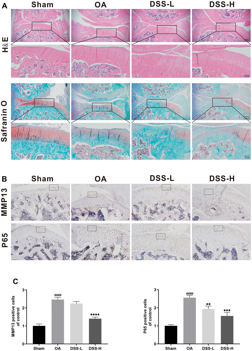 To further explore the effect of DSS on the progress of OA in vivo, a surgically induced rat OA model was established, followed by gavage of DSS or saline for 6 weeks. Hematological examination of the cartilage was performed by using H&E and Safranin O staining. The OA group exhibited significant pathologic changes, including severe cartilage destruction, cartilage erosion, and apparent chondrocyte hypocellularity when compared with the sham group (Figure 8A). In contrast, treatment with DSS remarkably reduced cartilage destruction compared with the OA group, especially in the DSS-H group. Additionally, immunohistochemical results showed that the number of MMP13 and p65 positive cells was increased in the OA group, while the protein expression of MMP13 and p65 reduced significantly in the DSS-H group (Figure 8B, 8C). Altogether, these data demonstrated that DSS efficiently suppressed OA progression in vivo.