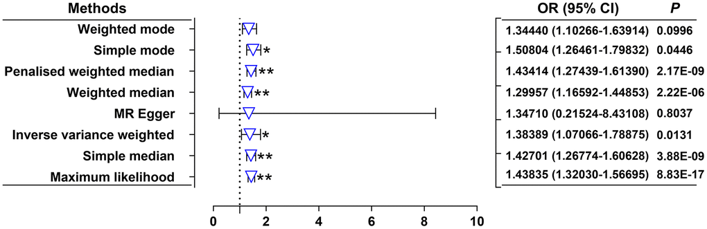 Due to limited availability of comprehensive data within a single cohort, we performed a TSMR approach to analyze data from two distinct samples, one for the exposure of interest and the other for the outcome [44]. We employed eight MR methods, including inverse-variance weighted (IVW), MR-Egger, penalized weighted median, simple mode, simple median, maximum likelihood, weighted mode, and weighted median, to compute follow-up sensitivity [45, 46]. The IVW test, a random-effects model, was used to estimate the primary causal effect values when there was no horizontal pleiotropy, providing unbiased estimates [13]. The remaining seven MR methods were supplementary approaches for MR analysis and were more resilient to individual genetics with strong outlier causal estimates. These methods produced consistent estimates of causal effects when the effective IVs exceeded 50% [43]. By leveraging the strengths of each MR method, these eight approaches complemented one another and provided reliable causal effects for our research when the direction of β values was consistent.