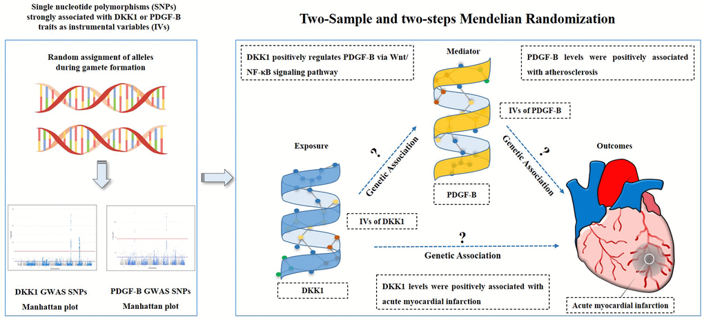 Observational research has inherent limitations such as confounding and reverse causality, necessitating the use of more effective methods to explore causality between features. Hence, Mendelian randomization (MR) is a widely used approach to infer causality by using genetic variations associated with the exposure of interest as instrumental variables (IVs) [13]. Since genetic variations are randomly assigned at conception, their relationship with outcomes is less likely to be influenced by environmental confounders. Furthermore, the MR mediation analysis employing a two-step approach has a potential in identifying the mediating role of certain factors in the causal relationship between exposures and outcomes, thereby reducing the common biases inherent in multivariable approaches [14, 15]. To the best of our knowledge, no previous study has established the causal relationship between DKK1, PDGF-B, and the risk of AMI using MR. Hence, this study was aimed to assess the causal effect of DKK1 and PDGF-B on the risk of AMI using the MR framework and identify the mediating effect of PDGF-B in the causal effect of DKK1 on the risk of AMI.