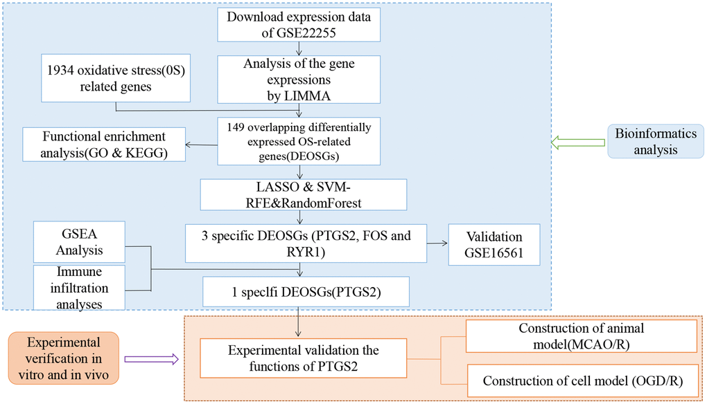 Our results provided novel targets for predicting IS progression and confirmed that PTGS2, FOS and RYR1 have good diagnostic value for IS by a comprehensive bioinformatics analysis with three machine learning algorithms. Through in vivo and in vitro experimental validation, we found that the injury mechanism of IS involved oxidative stress and ferroptosis, inhibition of PTGS2 may alleviate the cerebral ischemic damage partly by anti-oxidative stress and ferroptosis. However, further meticulous works are warranted to deeply clarify the underlying mechanisms. Our findings might be conducive to clarify the pathogenesis of IS from a new perspective and provide a new horizon for clinical treatment.