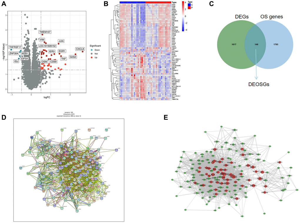 The analysis of differentially expressed genes (DGEs) (GSE22255) was performed by the “limma” package. A total of 1766 DEGs were obtained. Figure 2A, 2B showed the volcano and heatmap. Using the GeneCards (https://www.genecards.org/), a comprehensive database for searching and predicting a wide range of human genes, we obtained 1934 OS genes (relevance score ≥4) from GeneCards. Among the DEGs and OS genes, there were 149 overlapping items between DEGs and OS genes (Figure 2C). Here, we selected the 149 DEOSGs overlapping for subsequent researches. The PPI network of DEOSGs was visualized by Cytoscape software (Figure 2D, 2E).