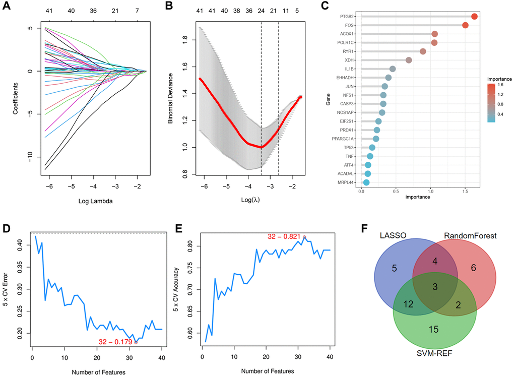 Next, we selected three novel machine learning algorithms to further screen out the key DEOSGs that are more important for the diagnosis and prognosis of our disease. We identified 24 specific DEOSGs (RYR1, FOS, PTGS2, PPARGC1A, NFS1, etc.,) with the LASSO logistic regression algorithm (Figure 4A, 4B). Furthermore, 15 specific DEOSGs (PTGS2, FOS, ACOX1, POLR1C, PTGS2, etc.,) were next filtered according to the Random Forest algorithm and the analysis of these 15 specific DEOSGs in Random Forest algorithm was shown in Figure 4C, where the more prominent the red color was, the more important the DEOSGs were for IS diagnosis. In addition, 32 specific DEOSGs (MPO, PRDX3, RYR1, STIP1, NOS1, etc.,) were then detected by SVM-REF algorithm, of which the error and accuracy analysis were showed in Figure 4D, 4E. Finally, 3 DEOSGs (PTGS2, FOS and RYR1) were selected by the combination of the three algorithms for the future validation (Figure 4F).