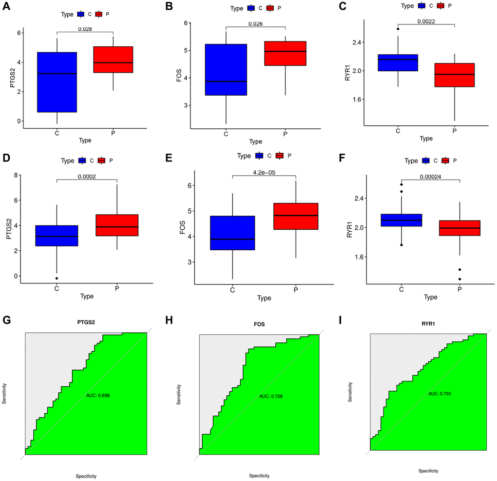 We explored the expressions of the 3 DEOSGs in the GSE22255 dataset and found that PTGS2 and FOS were highly expressed and RYR1 was lowly expressed in the IS group (Figure 5A–5C). And then GSE16561 was selected to further validate the expression value of these 3 DEOSGs. The trends of the two databases were consistent (Figure 5D–5F). Subsequently, we plotted receiver operating characteristic (ROC) curve to thoroughly test their efficacy. For PTGS2, the area under the curve (AUC) was 0.698 (Figure 5G). Notably, the AUC for FOS was 0.728 (Figure 5H), and the AUC for RYR1 was 0.703 (Figure 5I). All results indicated that the PTGS2, FOS and RYR1 had high diagnostic values in IS.