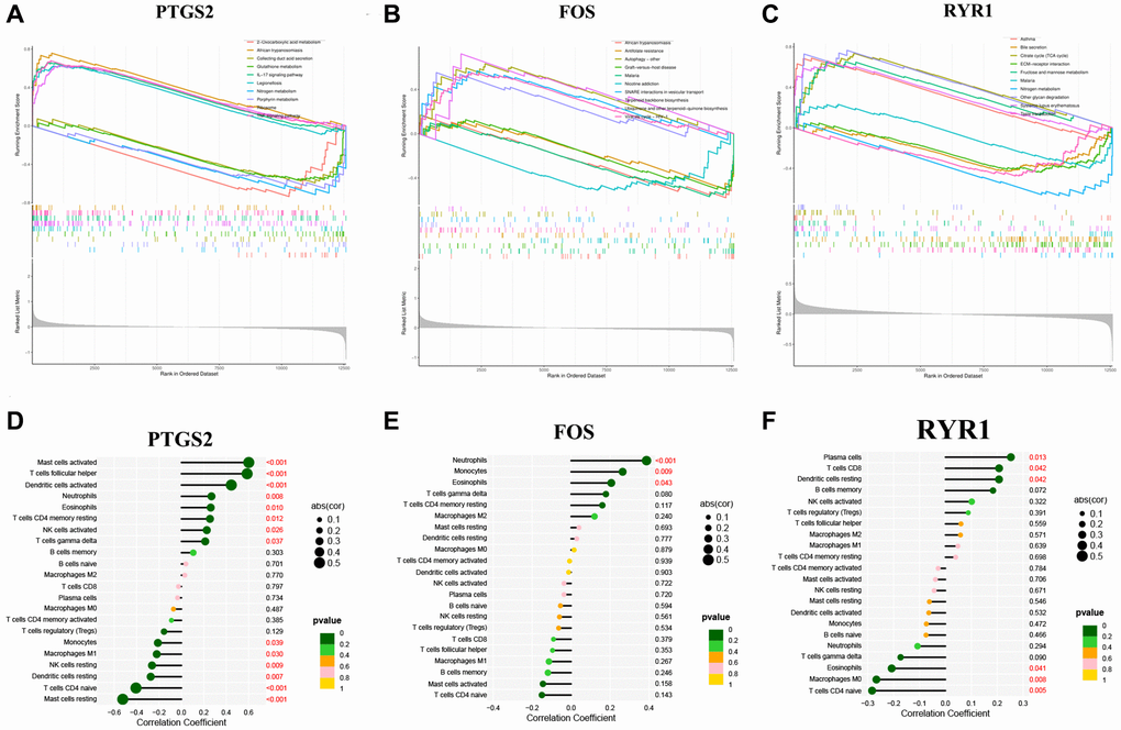 The potential functions of our 3 diagnostic DEOSGs were explored using GSEA. DEOSGs in the high-expression cohorts were highly enriched in inflammatory (such as NF-κB pathway), OS-related signaling pathway and atherosclerosis, respectively (Figure 6A–6C). After considering the founding of GSEA, we deeply explored the correlation between these three DEOSGs and inflammation. Figure 6D–6F confirmed the correlation between 3 diagnostic DEOSGs and 22 immune cells. Surprisingly, there existed obviously positive correlation between PTGS2 and 2 immune cells (Mast cells activated and T cells follicular helper), as well as obviously negative correlation between PTGS2 and Mast cells resting. Moreover, FOS was positively correlated with Neutrophils, but negatively correlated with T cells CD4 naive. Besides, RYR1 was positively correlated with Plasma cells, but negatively correlated with Macrophages M0 and T cells CD4 naive. These exploratory findings will guide us to further comprehend the critical role of these DEOSGs.