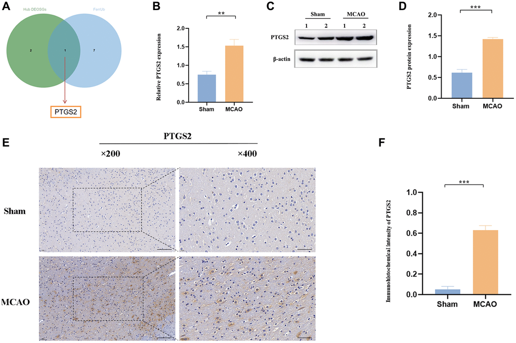 Ferroptosis, a newly described non-apoptotic programmed pattern of iron-dependent cell death, also has been identified to cause substantial damage to the structural and functional integrity of brain tissue [27]. OS and ferroptosis both play fatal roles in the complicated pathological progress in IS, however, there are still few studies on the combination of them in IS. Here, among the specific DEOSGs, only PTGS2 was existed as upregulated ferroptosis-related DEGs (Figure 7A). Following our machine learning analysis described above, RT-qPCR, Western blot and IHC were conducted to clearly verify the role of PTGS2 in the ischemic cortex of rats. In Figure 7B–7D, not only mRNA level but also protein level showed the same significant increase (P < 0.05) trend of PTGS2 following MCAO/R 24 h compared with the control group. The results of IHC further confirmed the clear aggregation of PTGS2 in IS (Figure 7E, 7F).